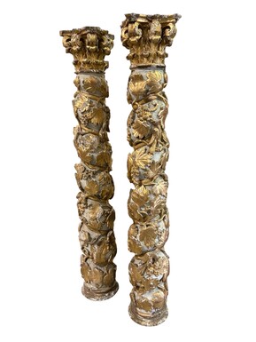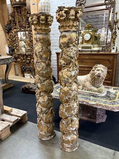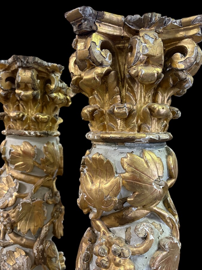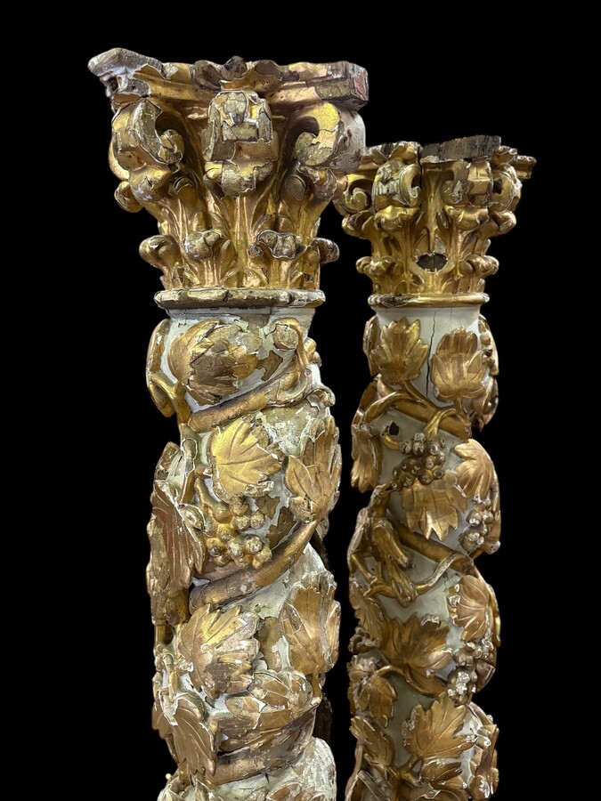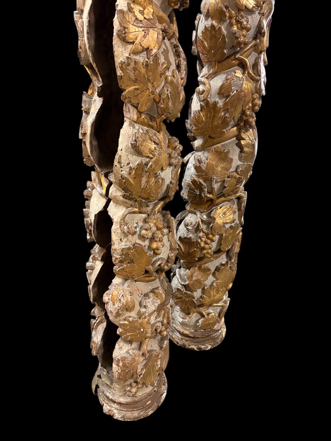 Pair of 17th-century Baroque twisted columns Highly decorative columns adorned with vines, birds and Corinthian capitals covered with antique gilding and polychrome decoration Columns in good condition with wear to the wood, gilding and polychrome.