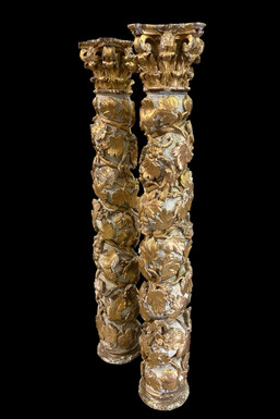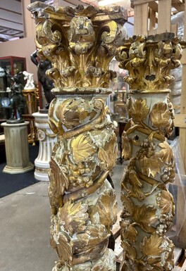 Pair of 17th-century Baroque twisted columns Highly decorative columns adorned with vines, birds and Corinthian capitals covered with antique gilding and polychrome decoration Columns in good condition with wear to the wood, gilding and polychrome.