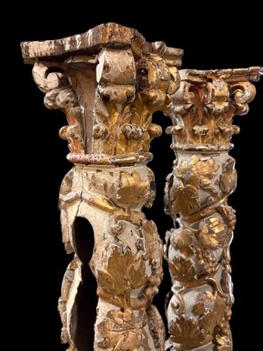 Pair of 17th-century Baroque twisted columns Highly decorative columns adorned with vines, birds and Corinthian capitals covered with antique gilding and polychrome decoration Columns in good condition with wear to the wood, gilding and polychrome.