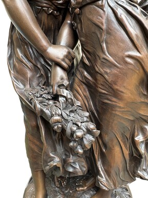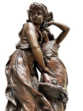 bronze sculpture depicting a young woman with a little girl carrying a basket of flowers. Very finely detailed, signed by Hippolyte Moreau and has a beautiful brown patina. François-Hippolyte Moreau (Dijon 1832–Neuilly-sur-Seine 1926)