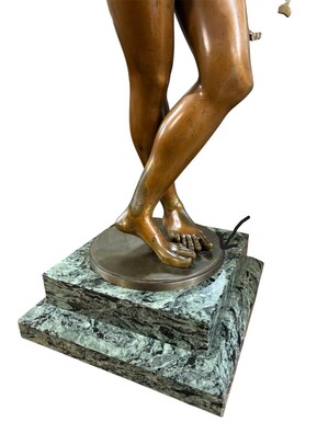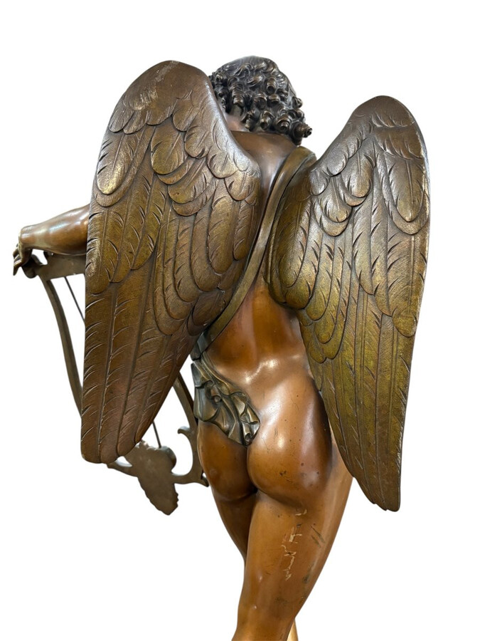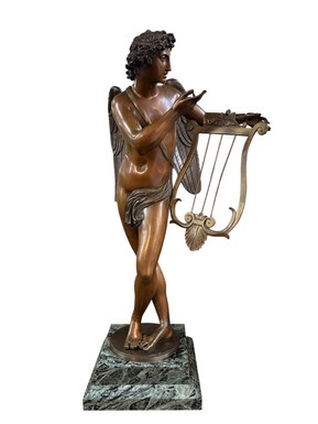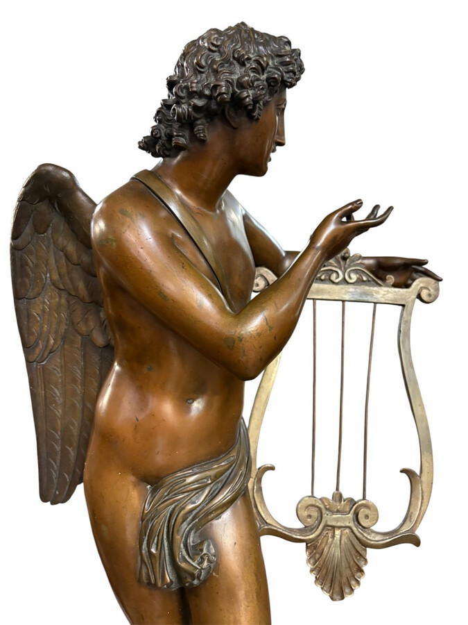 Large 19th century bronze ‘angel with lyre’ sculpture. Decorative sculpture representing an angel with a lyre on a coloured marble base. Marble base: 25 x 25 cm , 8 cm high. In good condition.