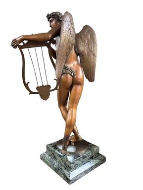 Large 19th century bronze ‘angel with lyre’ sculpture. Decorative sculpture representing an angel with a lyre on a coloured marble base. Marble base: 25 x 25 cm , 8 cm high. In good condition.