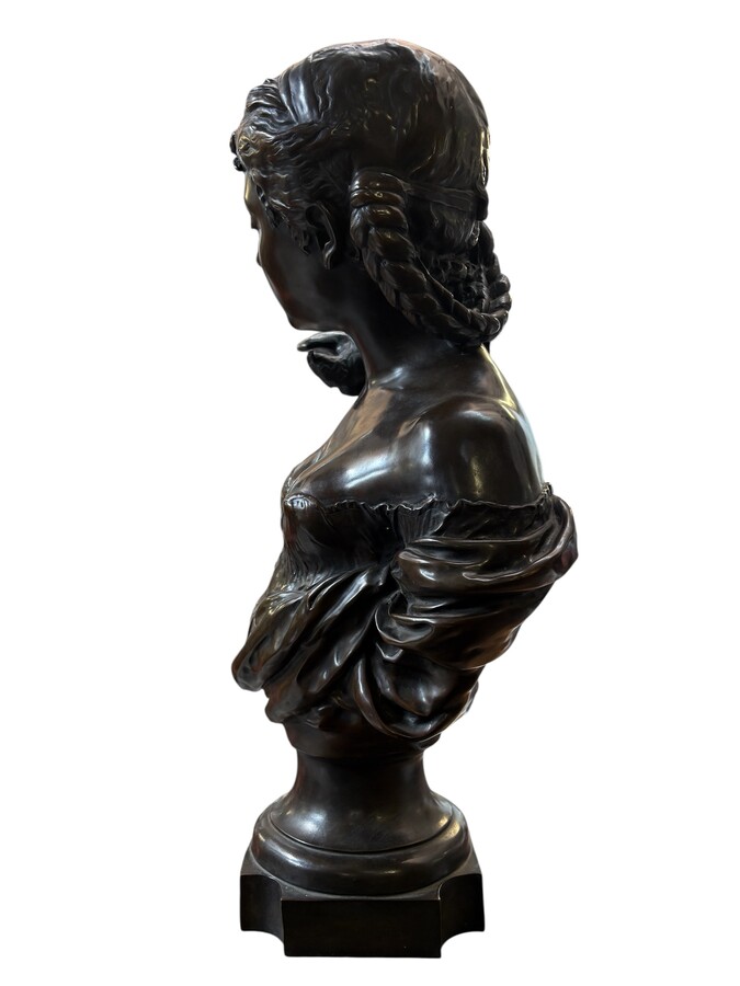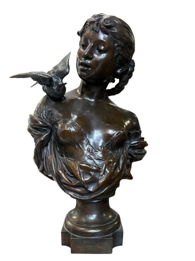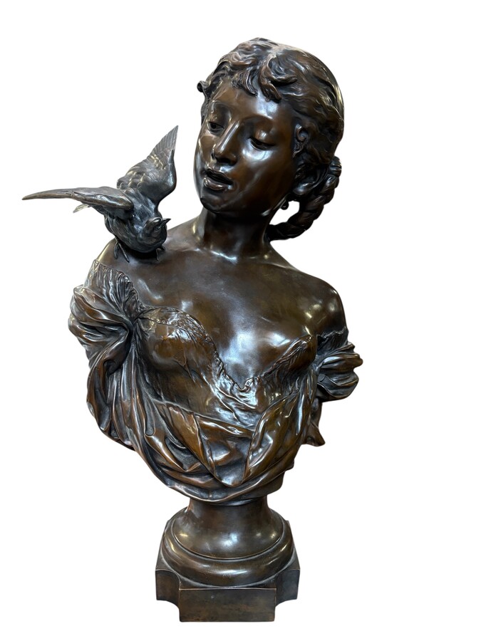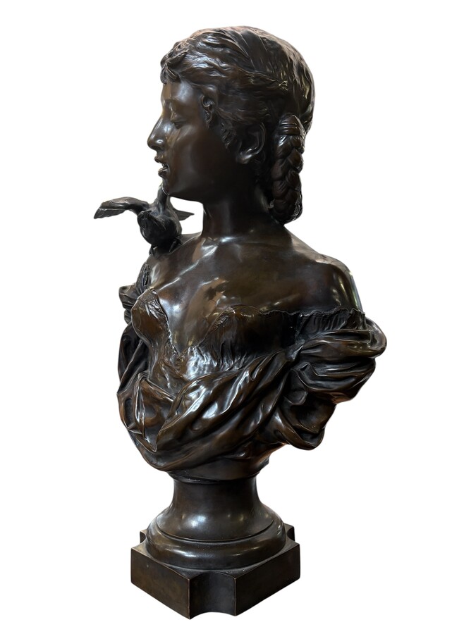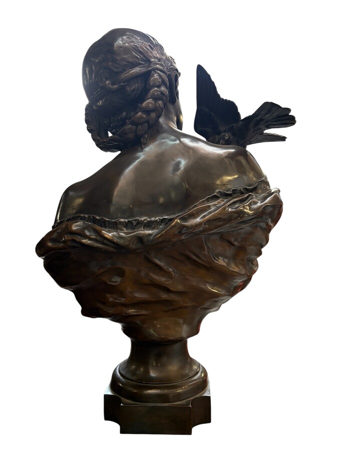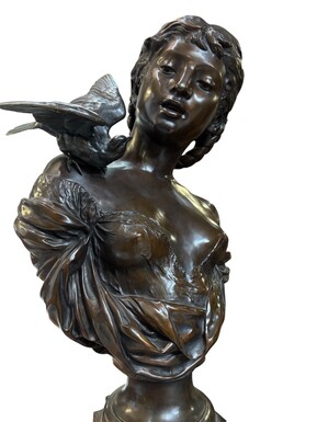 Large elegant 19th century bronze bust of a young woman with a bird (68 cm) Bronze bust of a young woman with a bird on her shoulder, signed by August Moreau (Dijon, 22 February 1834 - Malesherbes, 11 November 1917) Dimensions: Height: 68 cm Width: 40 cm