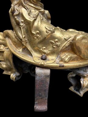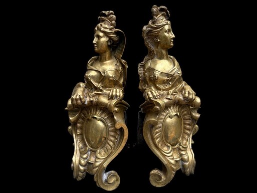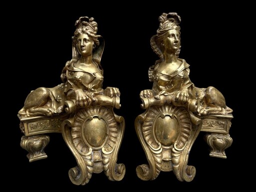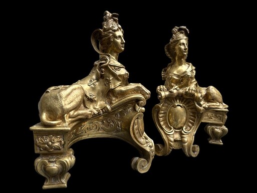 Pair of large Regency bronze ‘Sphinx’ andirons. Beautiful pair of gilt bronze andirons representing sphinxes supported by a coat of arms.Beautiful bronzes, high-quality workmanship, French,