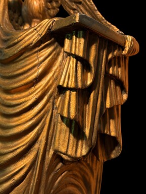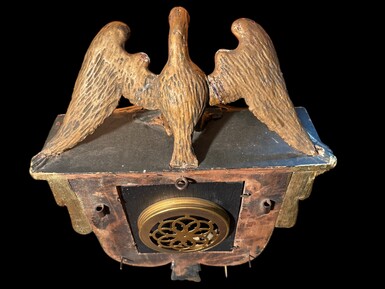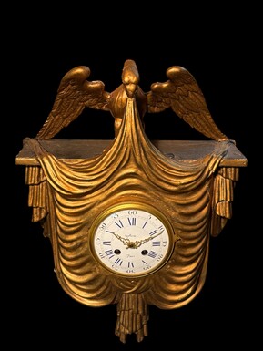 Elegant 19th-century gilt wooden eagle clock with drapery Decorative clock in gilt wood and paste depicting an eagle carrying a large drapery that falls to the left and right of the dial. In normal condition with a few small flaws on the wood.