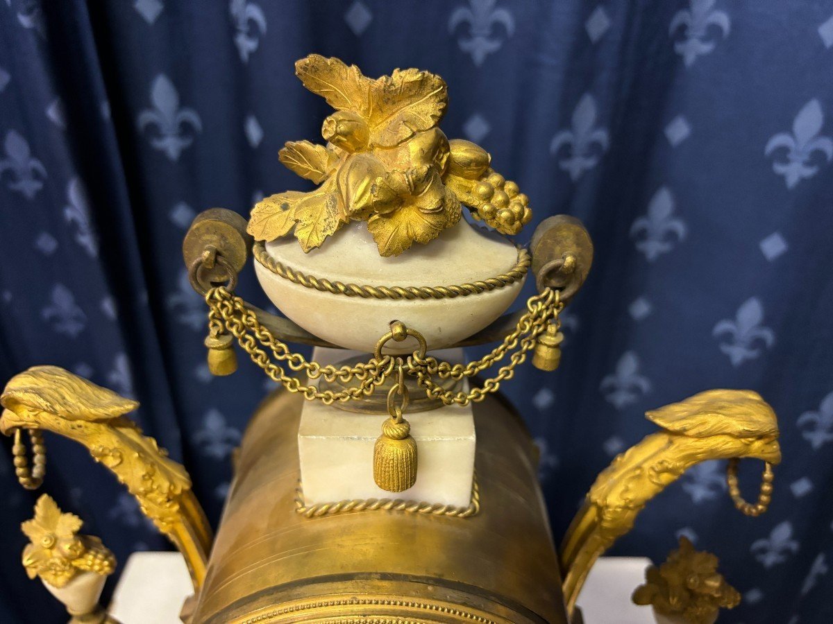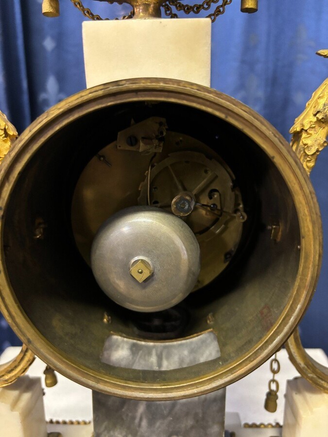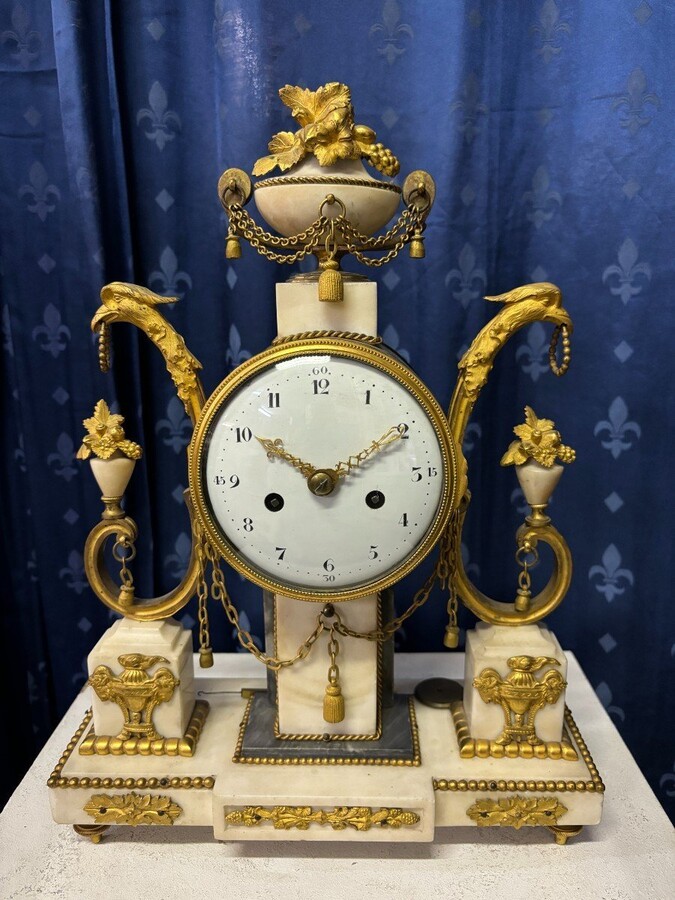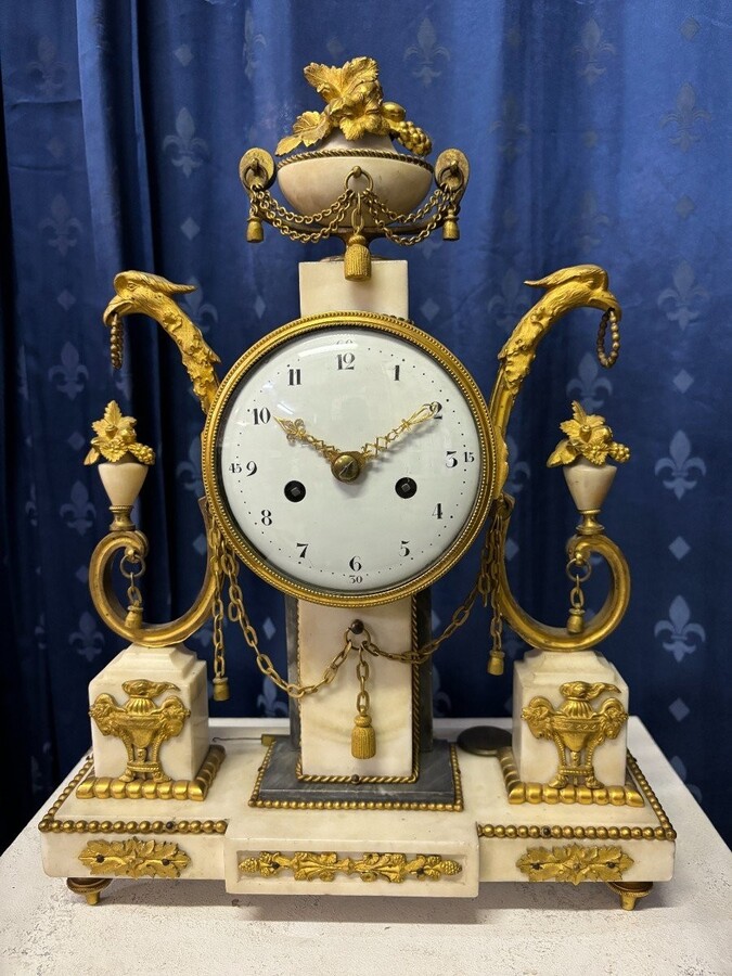 Elegant Louis XVI style clock from the 18th century. Beautiful 18th century marble and gilt bronze mantel clock decorated with vases of flowers, ornaments, griffin heads and bronze girlandes. The pendulum and key are present. 18thC.