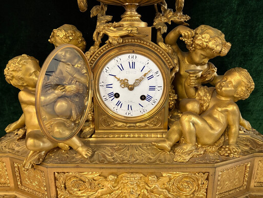 Large gilt bronze clock set. Paris, 19th century. A beautiful large clock with four cherubs and very fine gilt bronze decorations, as well as two candlesticks representing two large cherubs carrying a torch with six candlesticks.