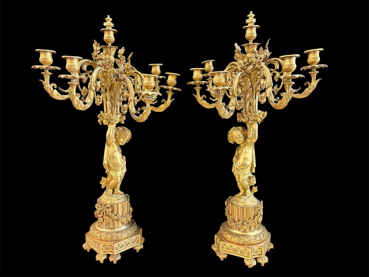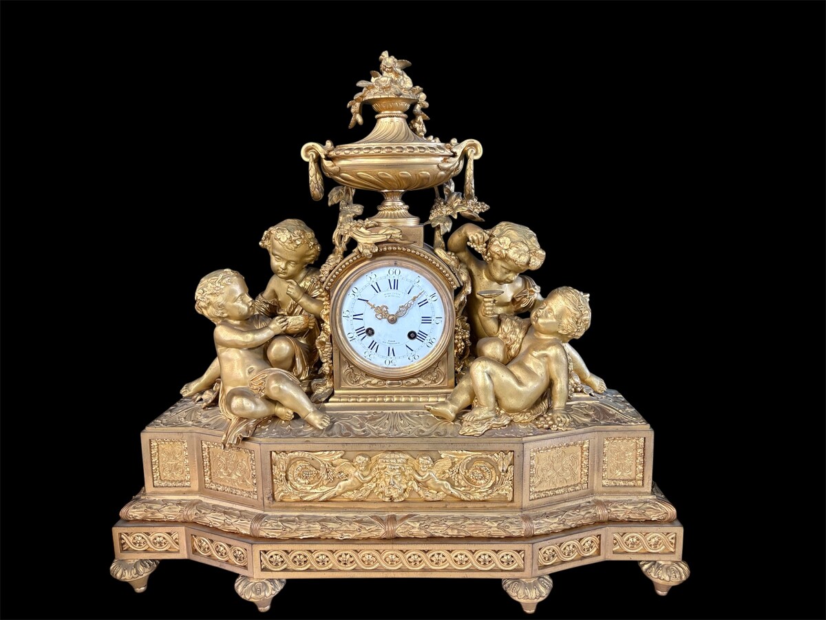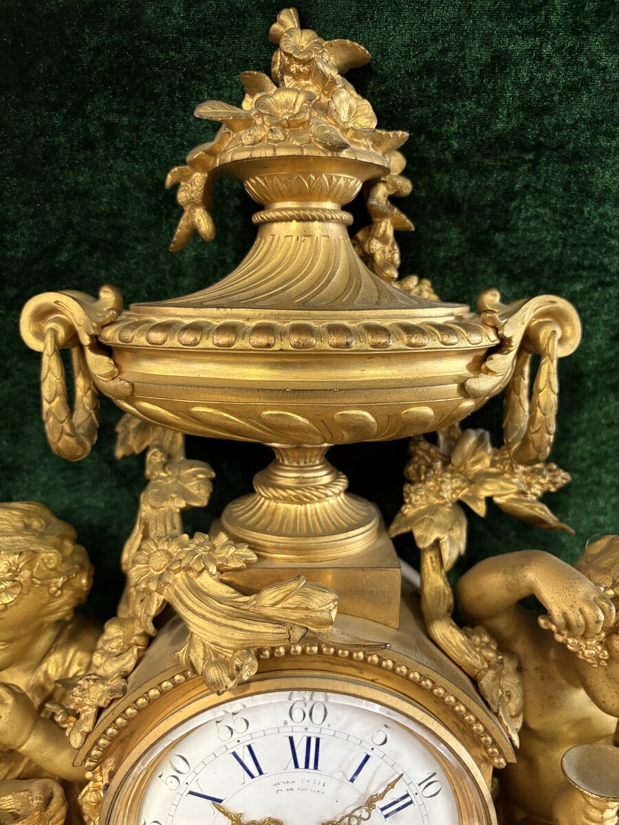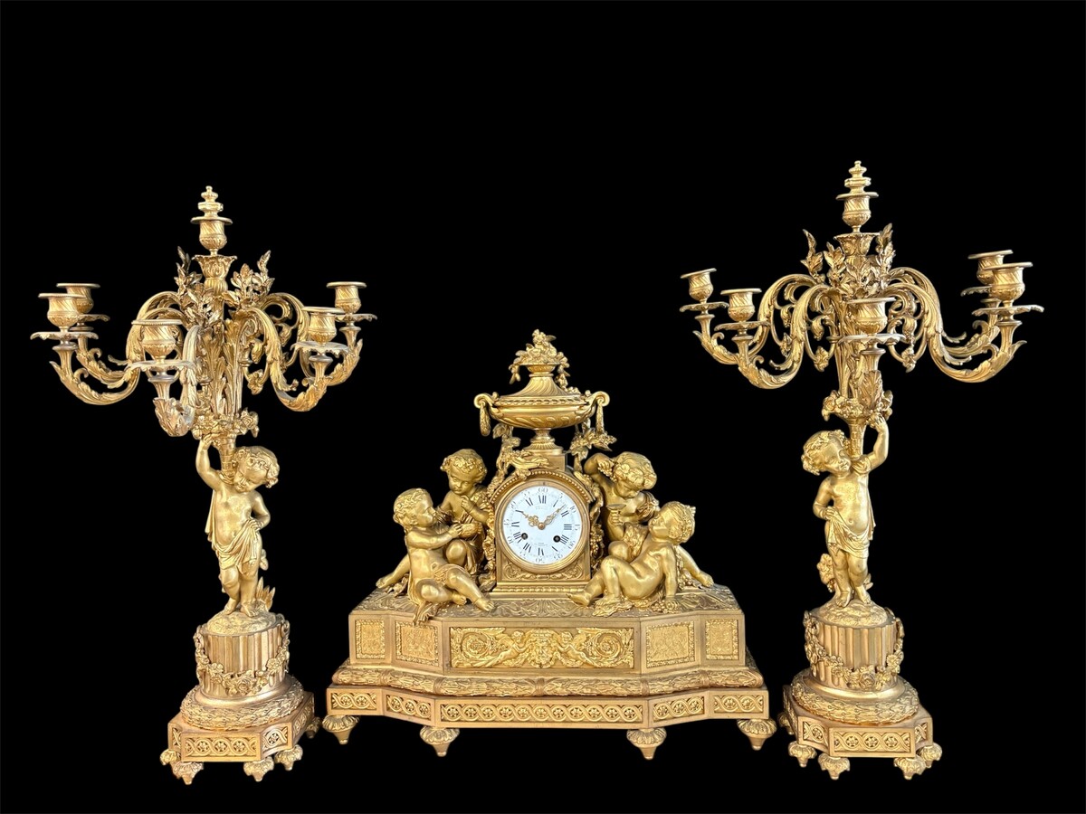 Large gilt bronze clock set. Paris, 19th century. A beautiful large clock with four cherubs and very fine gilt bronze decorations, as well as two candlesticks representing two large cherubs carrying a torch with six candlesticks. Dimensio
