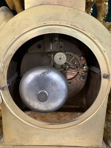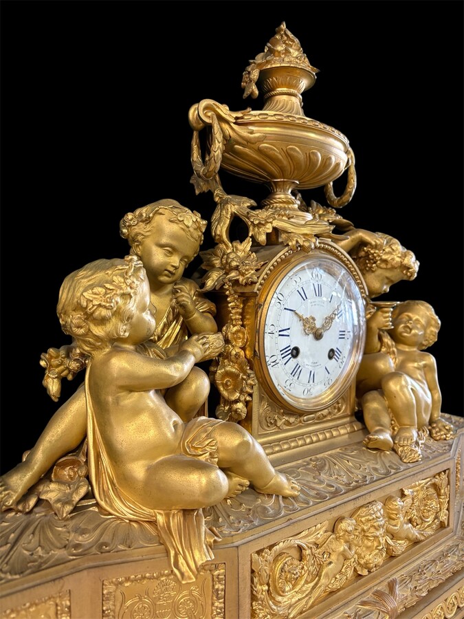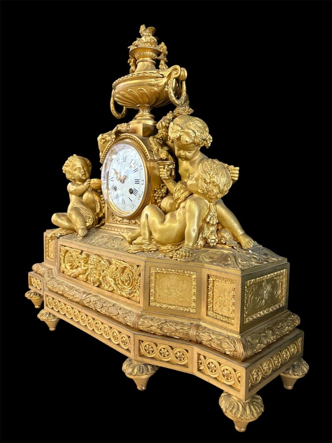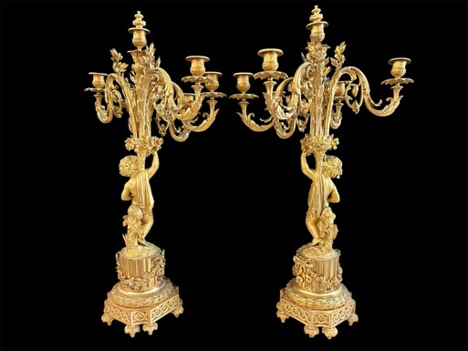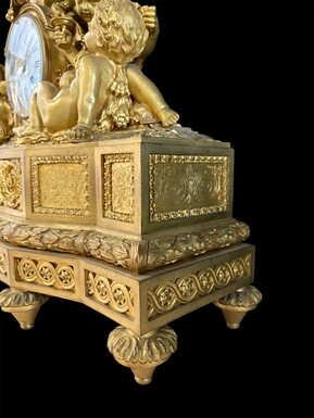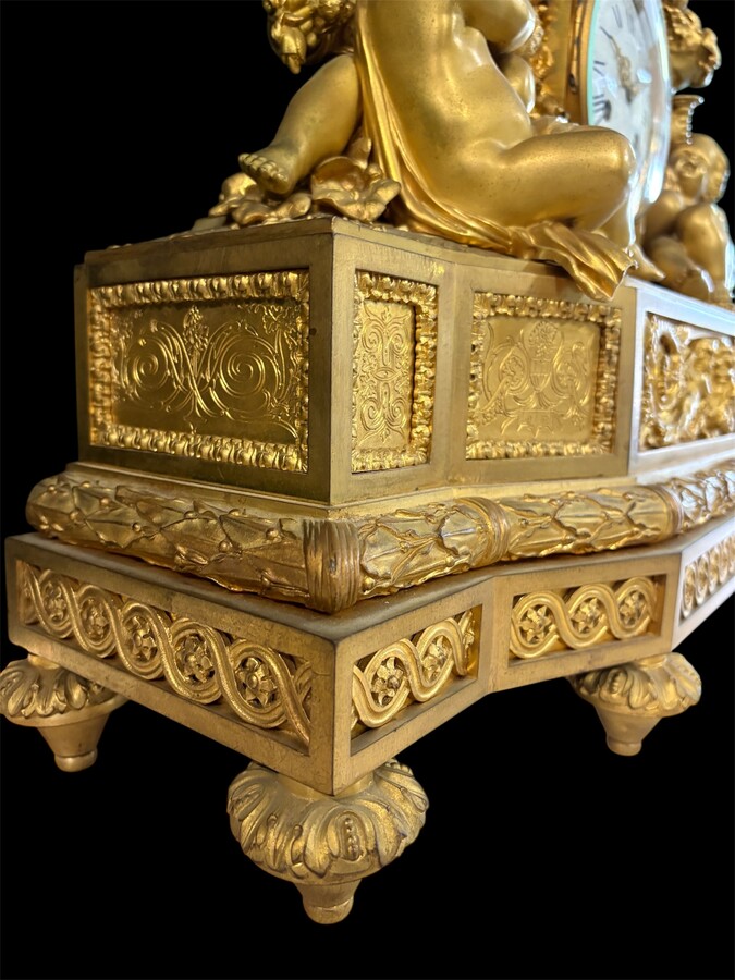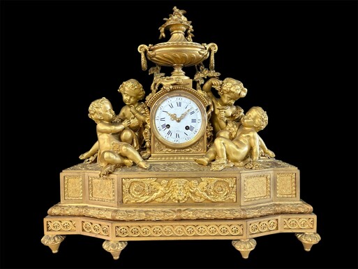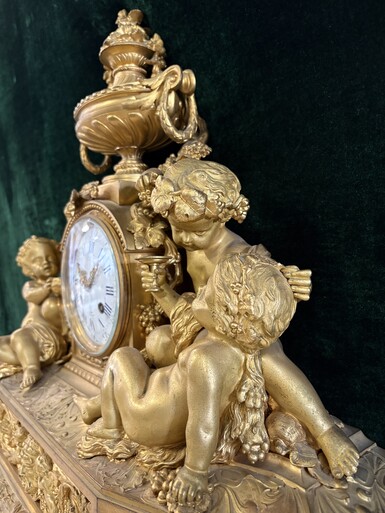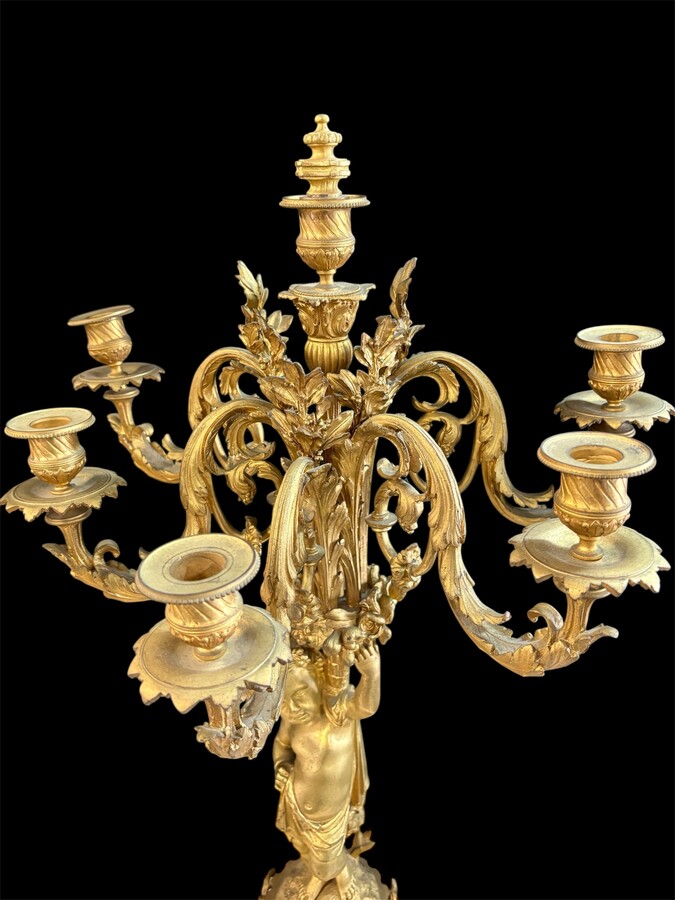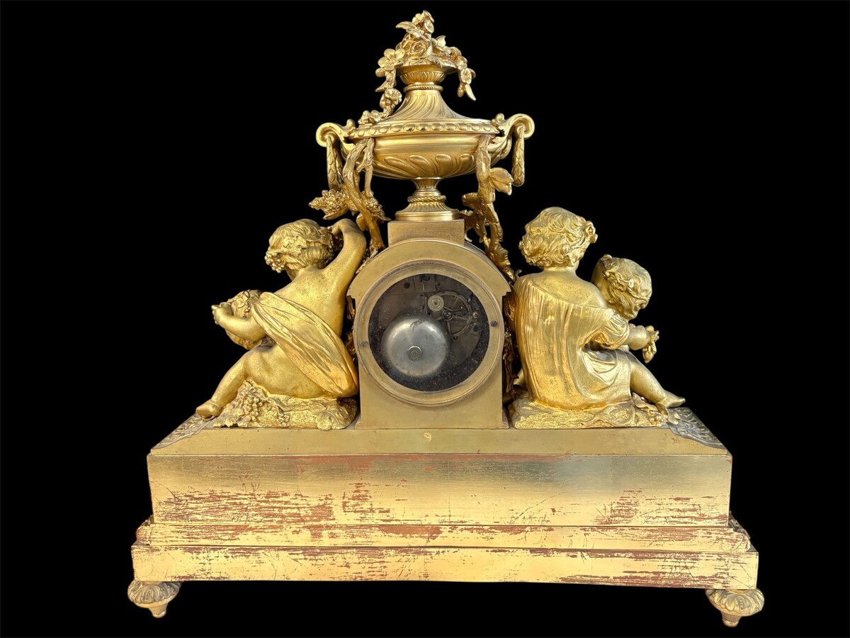 Large gilt bronze clock set. Paris, 19th century. A beautiful large clock with four cherubs and very fine gilt bronze decorations, as well as two candlesticks representing two large cherubs carrying a torch with six candlesticks. Dimensio