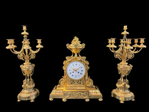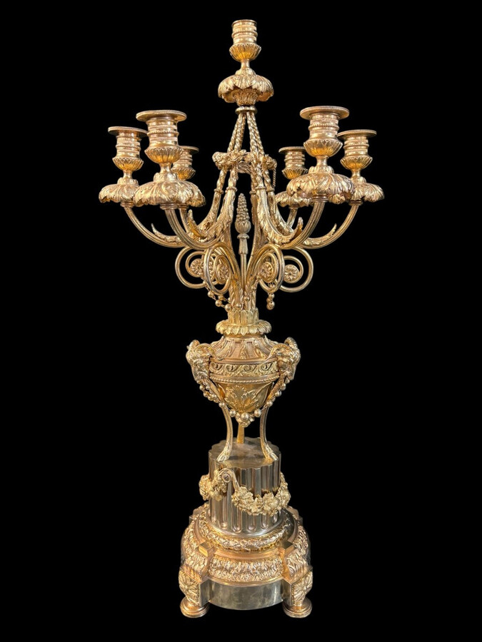 Large ormolu mantel set in the Louis XVI style, 19th century. Beautiful trim in good condition, clockwork to be checked, bell and pendulum missing. Louis Seize style model, candlesticks with 7 candlesticks