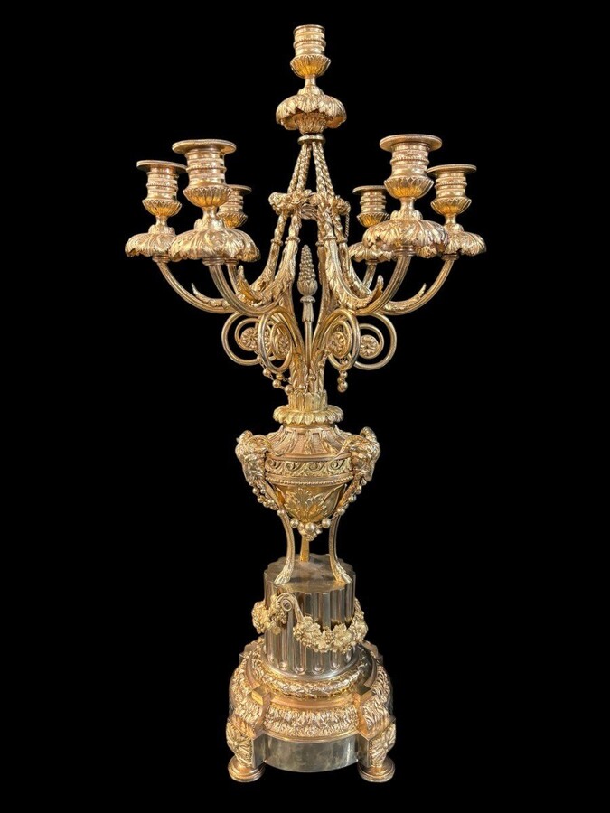 Large ormolu mantel set in the Louis XVI style, 19th century. Beautiful trim in good condition, clockwork to be checked, bell and pendulum missing. Louis Seize style model, candlesticks with 7 candlesticks
