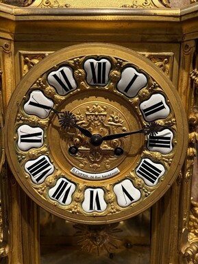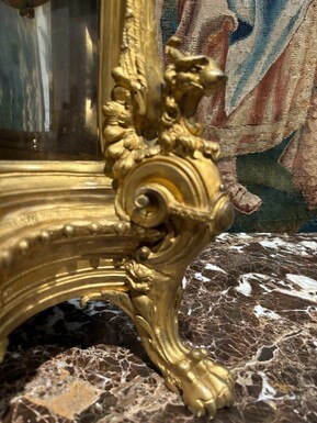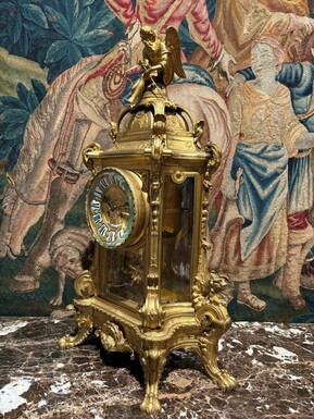 Large pendulum clock in gilt bronze with cut glass 19th century. Representation of Chronos figure , winged Mythological beasts and decorations in bronze working with a suns balance. Richly decorated dial signed R.COTTIN.26 Rue Amelot PARIS