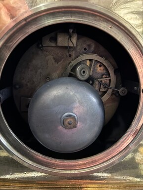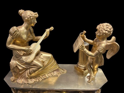 Nice Empire period clock in matt and bright gilt bronze depicting a lady playing guitar with an angel. In very good condition, the movement has not been checked. The balance wheel is present. Dimensions: Width: 31.5 cm Height: 43 cm Depth : 13 cm