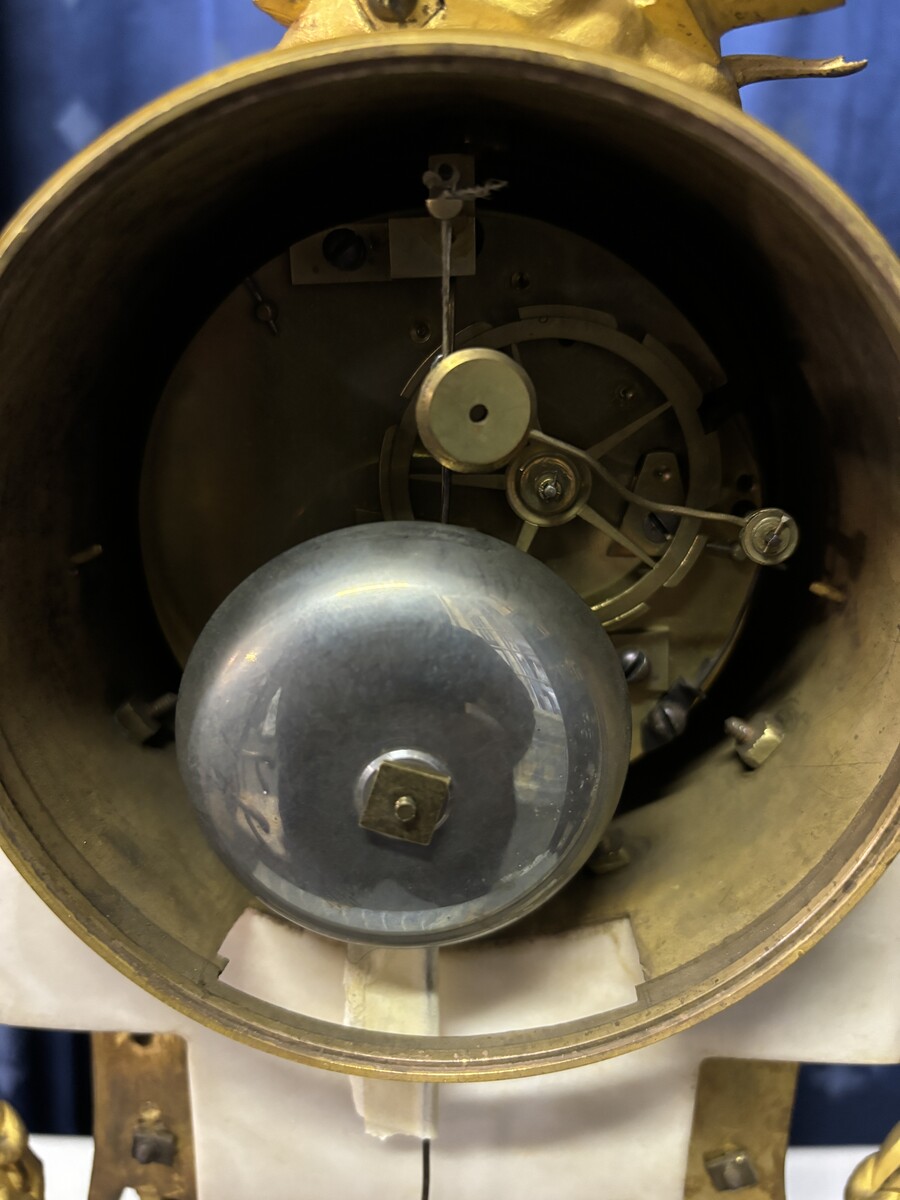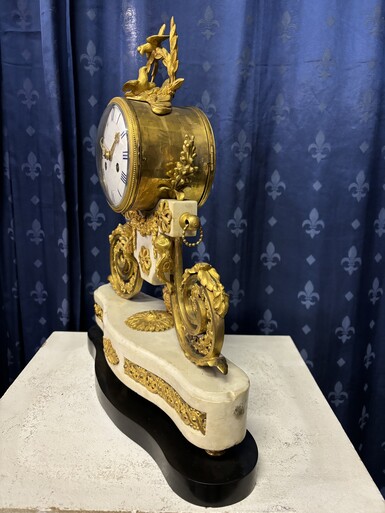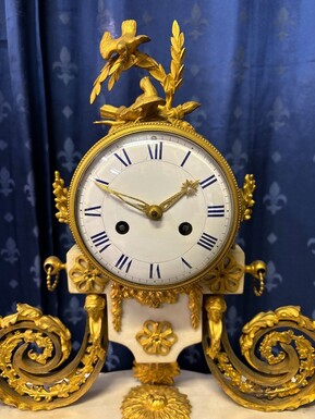 Nice Louis XVI style clock in marble and gilt bronze 18th century Elegant mantel clock decorated with gilt bronze ornaments, women's heads, birds, foliage and its original sundial. Minor old restoration to the marble base. Dimensions : Height: 41 cm