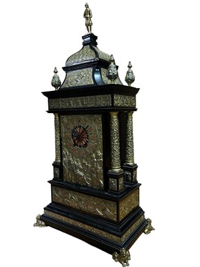Special large mantel clock in wood / bronze and hammered copper 19th century. Very decorative mantel clock with 4 columns and ornaments in bronze, decorated with scenes of noblemen, soldiers and battles in hammered copper very finely detailed.