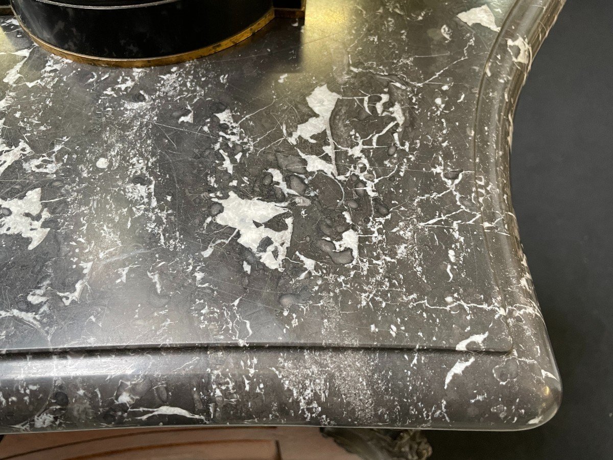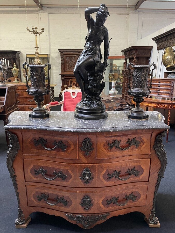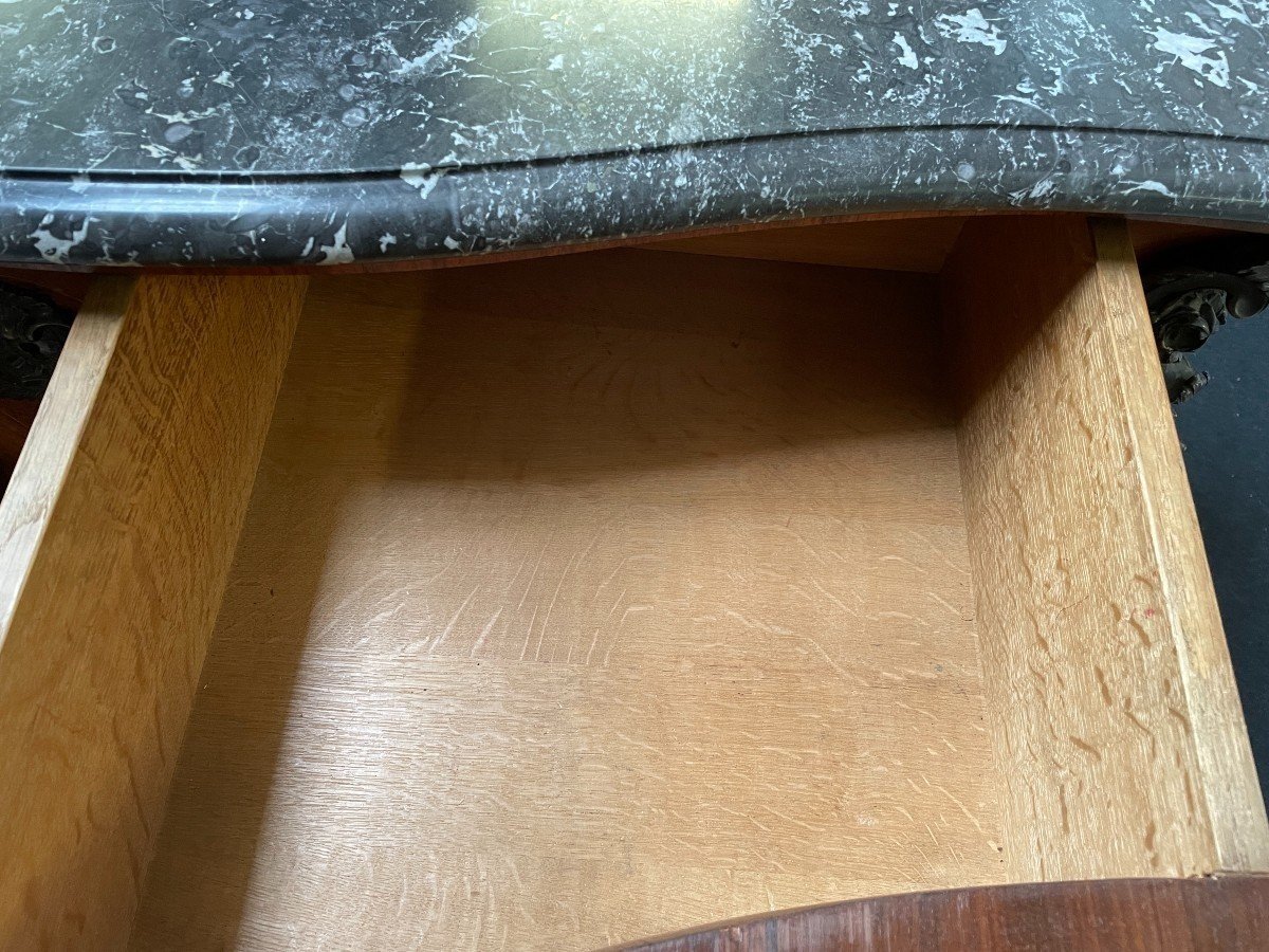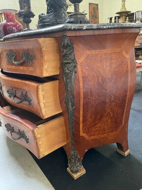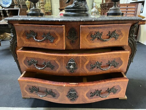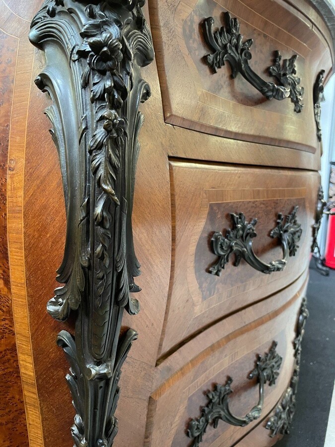 Large curved chest of drawers in the Louis XV style 1900 Beautiful model with a beautiful marble top, 2 drawers on top and 2 large drawers on the bottom. The front and sides are curved and have beautiful ornaments, lock plates and bronze handles.