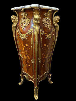 Pair of large Louis XV style marquetry/bronze columns, 20th century. High-quality columns adorned with fine marquetry and decorated with angels, ornaments and bronze feet, topped with magnificent marble. The columns are decorated all around.