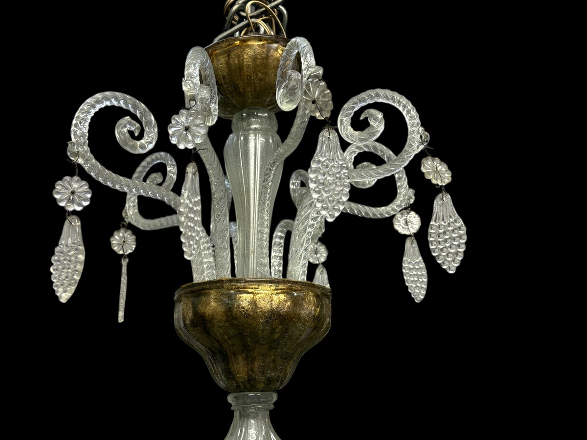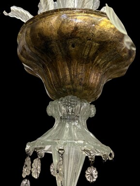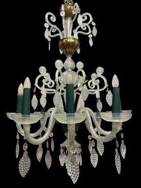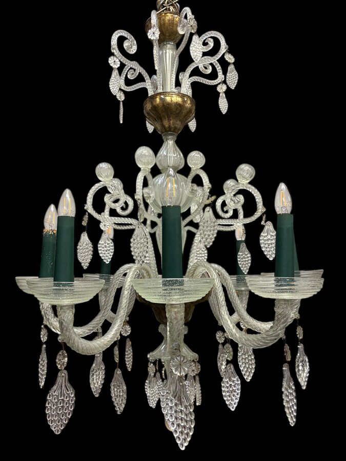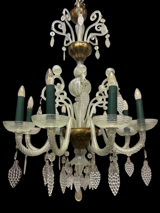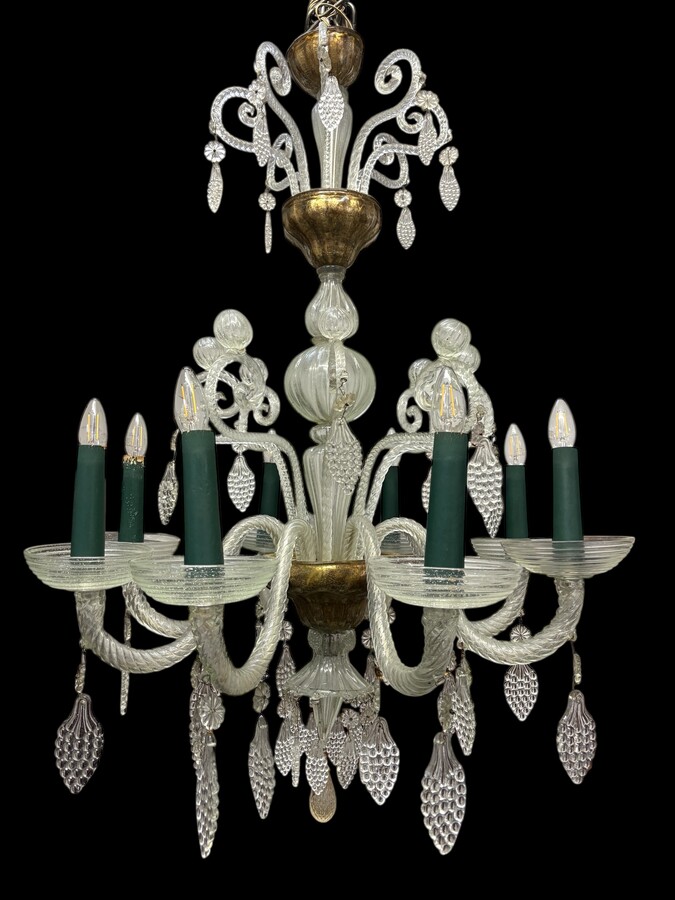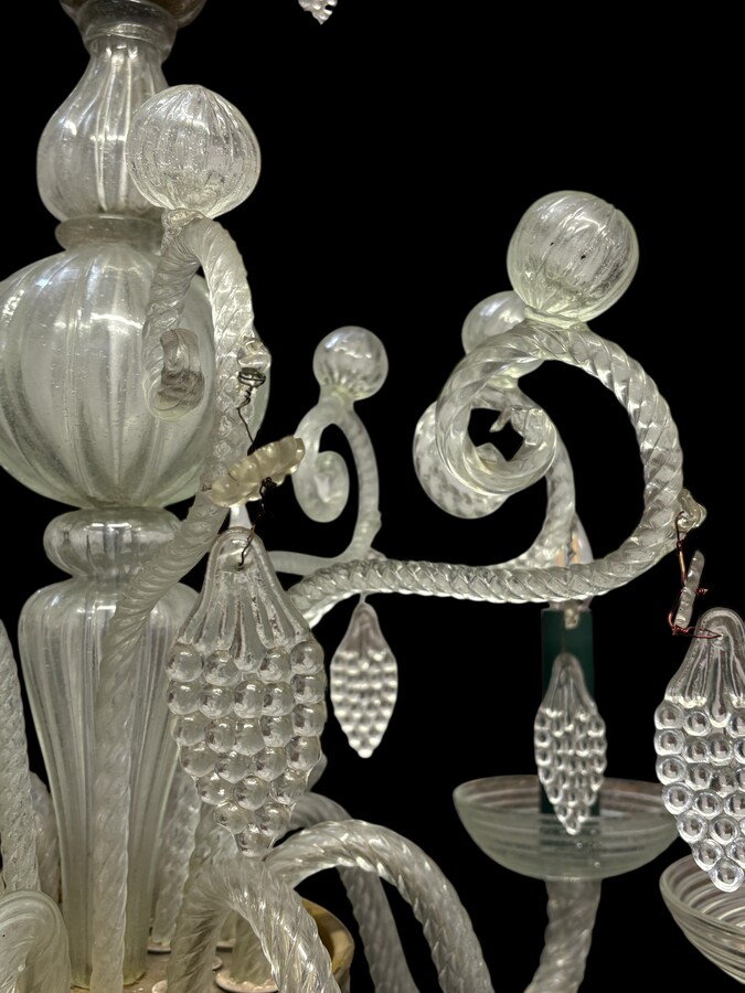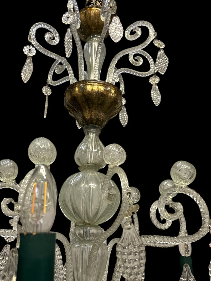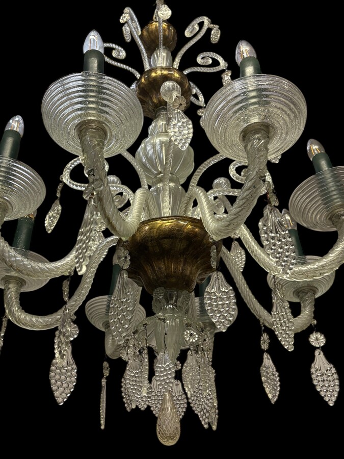 Large Liège chandelier with 8 arms, 19th century (112 cm). Beautiful decorative glass chandelier with 8 large arms featuring light points decorated with small and large scrolls adorned with glass balls, grape cluster-shaped nuggets