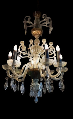 Large Liège chandelier with 8 arms, 19th century (112 cm). Beautiful decorative glass chandelier with 8 large arms featuring light points decorated with small and large scrolls adorned with glass balls, grape cluster-shaped nuggets