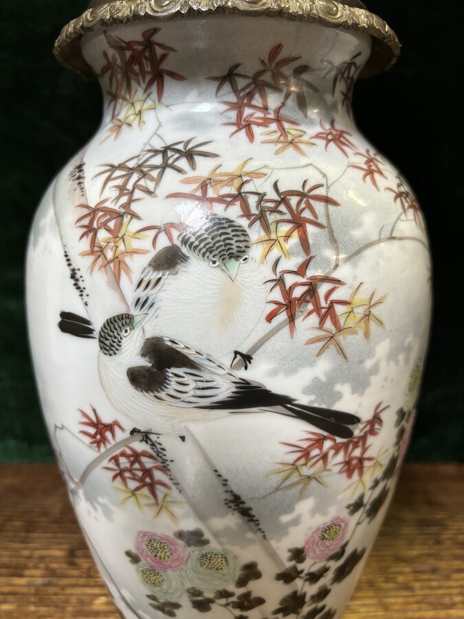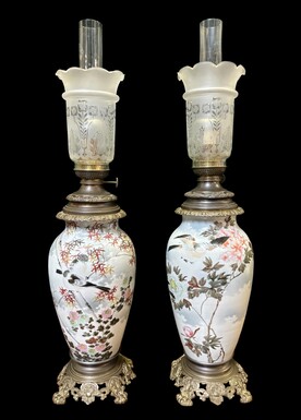 Pair of oil lamps in porcelain / bronze 19th century Porcelain very finely painted and decorated with birds and flowers and branches. In very good condition , only some damage to one brass mount ( see photo 12 ). Dimensions : Overall height : 73 cm Height