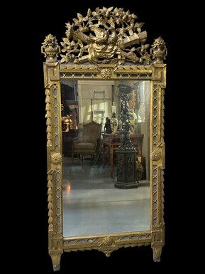 Large 18th century LXVI period mirror in gilded wood ( 184 cm ) Decorative mirror in carved, gilded and patinated wood. Dimensions : Height : 184 cm Width : 85 cm Depth : 5 cm In good condition, 18th century