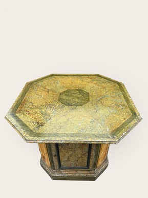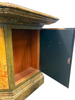 A special table painted to resemble marble 20th century. A decorative piece that can be used as a table, a pedestal or a piece of furniture. It features a triangular wooden top resting on a wooden base fitted with four panelled doors