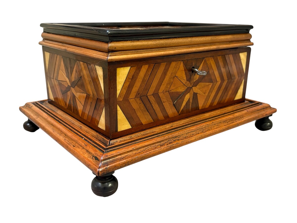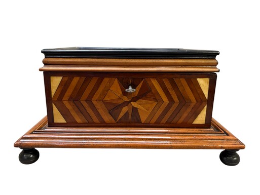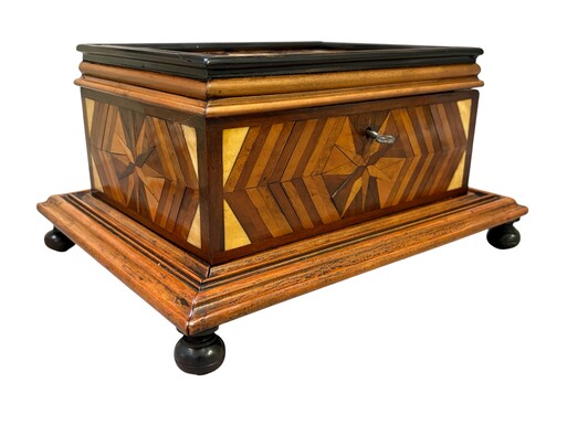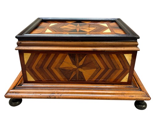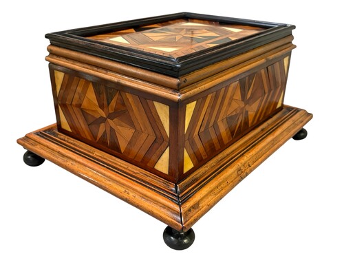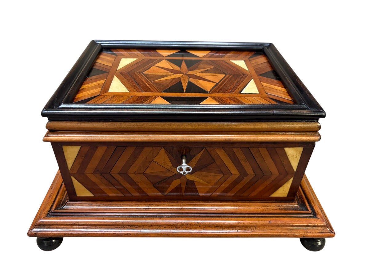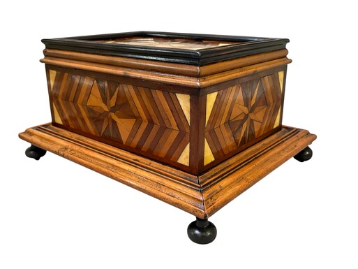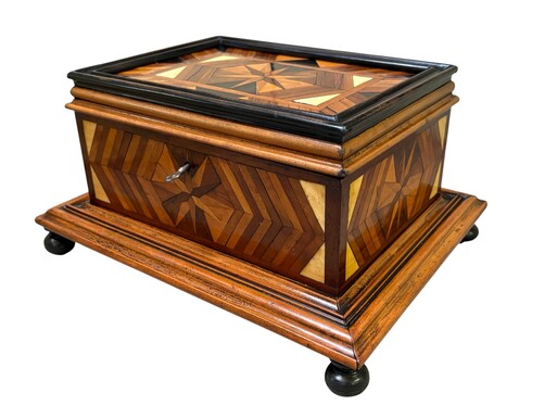 Beautiful parquet cigar box, early 19th century Highly decorative cigar box, 17th-century style, made of parquet in various woods, with lid, mirror, lock and key, resting on four ball feet. In very good condition, the box cannot be locked. Dimensions: Wid