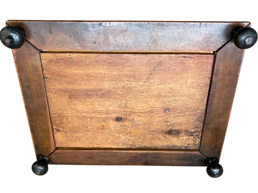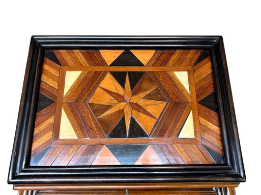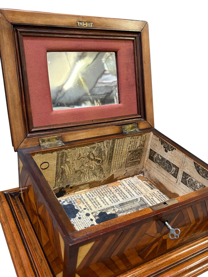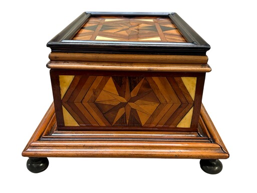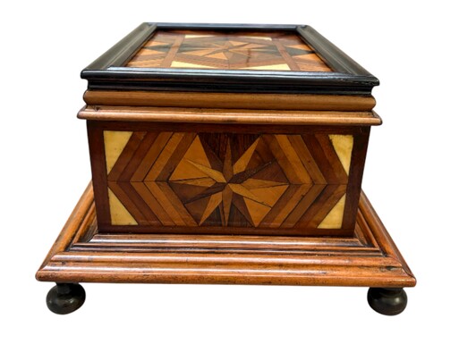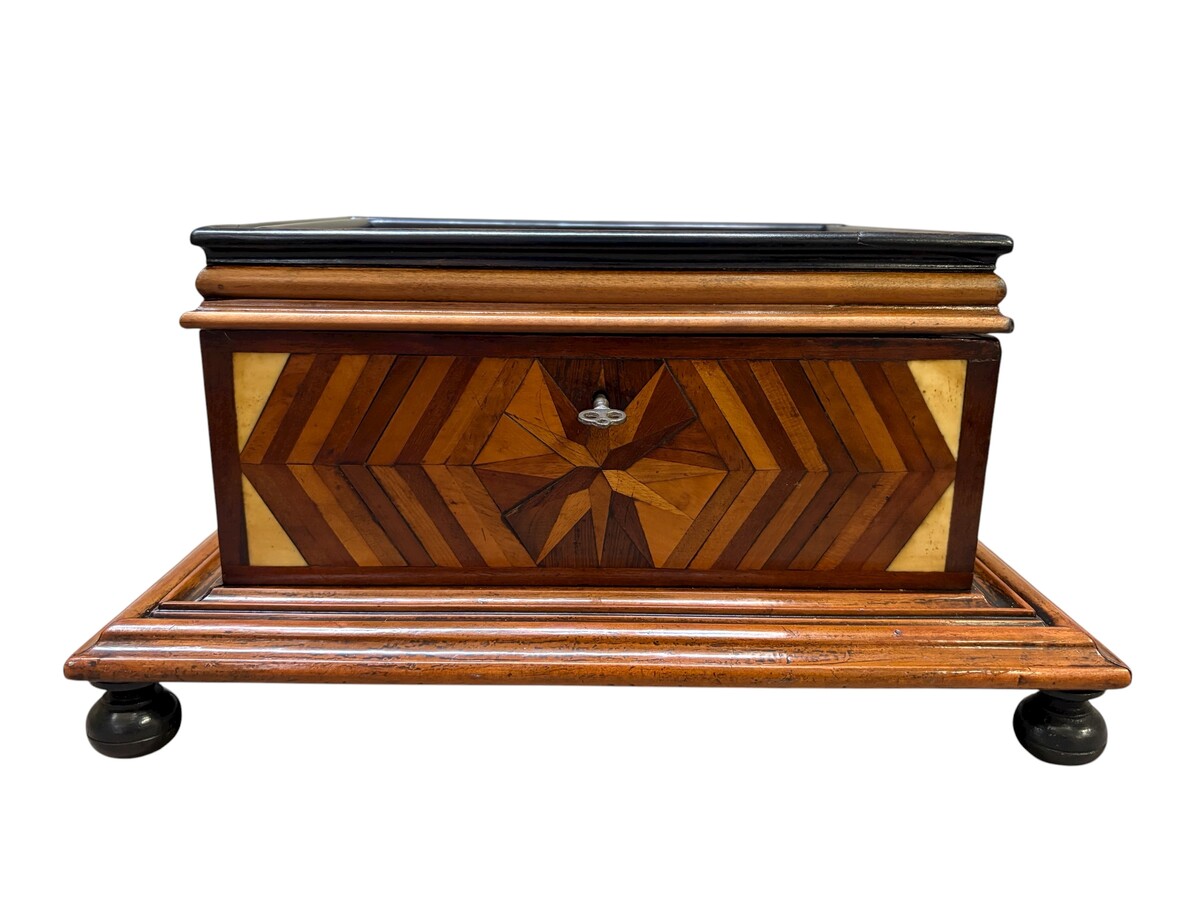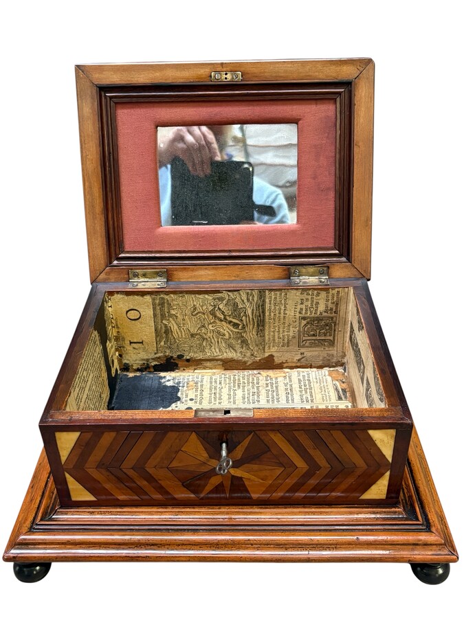 Beautiful parquet cigar box, early 19th century Highly decorative cigar box, 17th-century style, made of parquet in various woods, with lid, mirror, lock and key, resting on four ball feet. In very good condition, the box cannot be locked. Dimensions: Wid