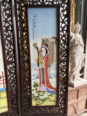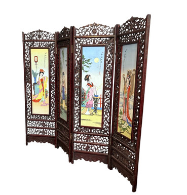 Chinese screen with four double-sided panels in wood/porcelain from the early 20th century. Large porcelain plaques depicting 4 elegant ladies on one side and 4 mountain landscapes on the other. All the panels are signed and in very good condition.