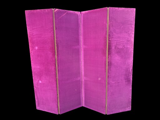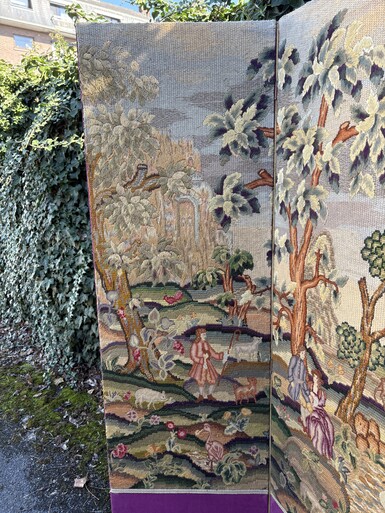 Decorative 4-panel embroidered screen, dating from 1900 A superb screen depicting romantic scenes featuring nobles, trees, animals, flowers, ponds, forests, etc. On the front, four large panels beautifully embroidered with a purple velvet border