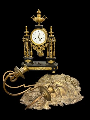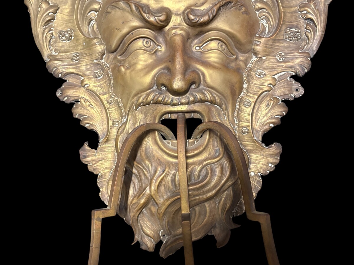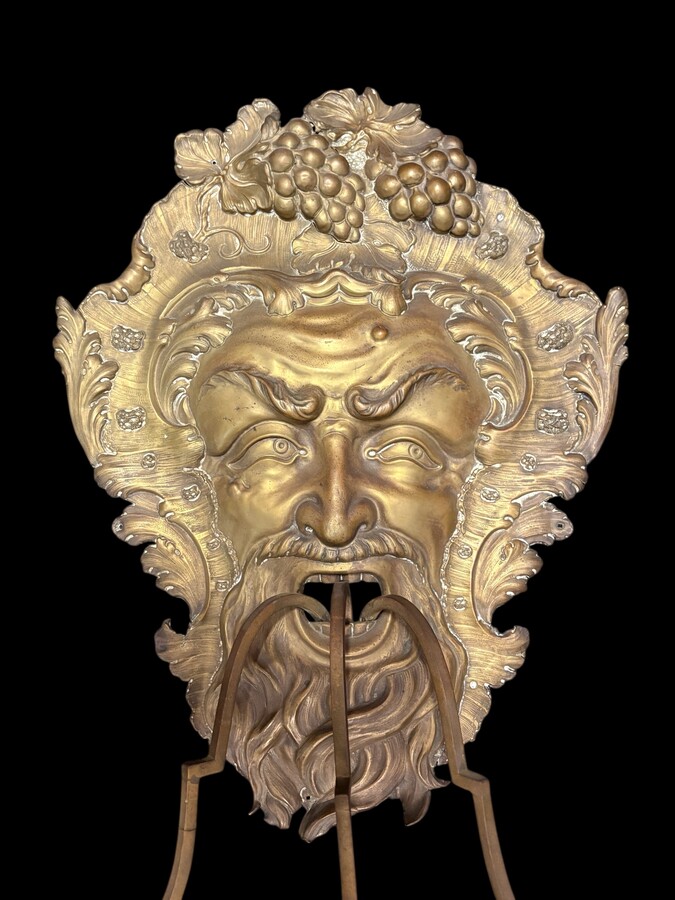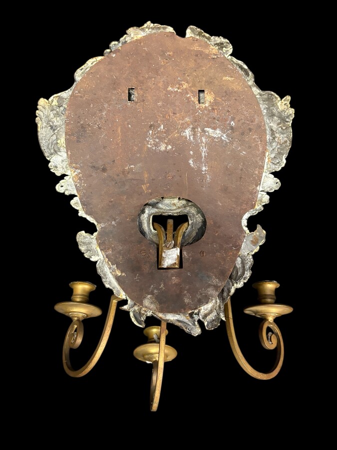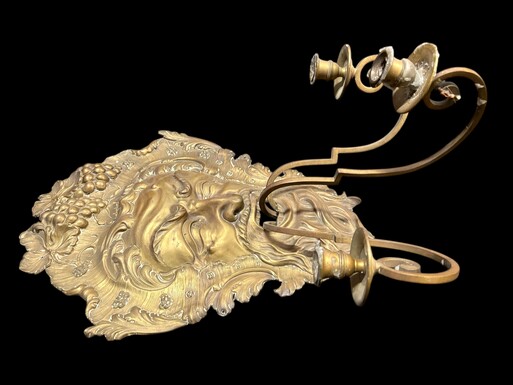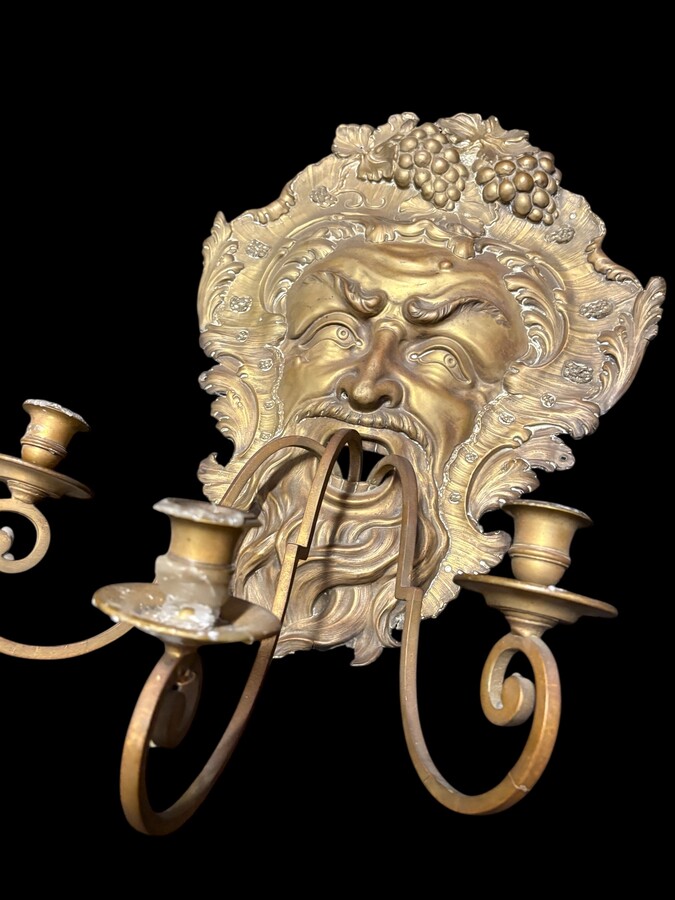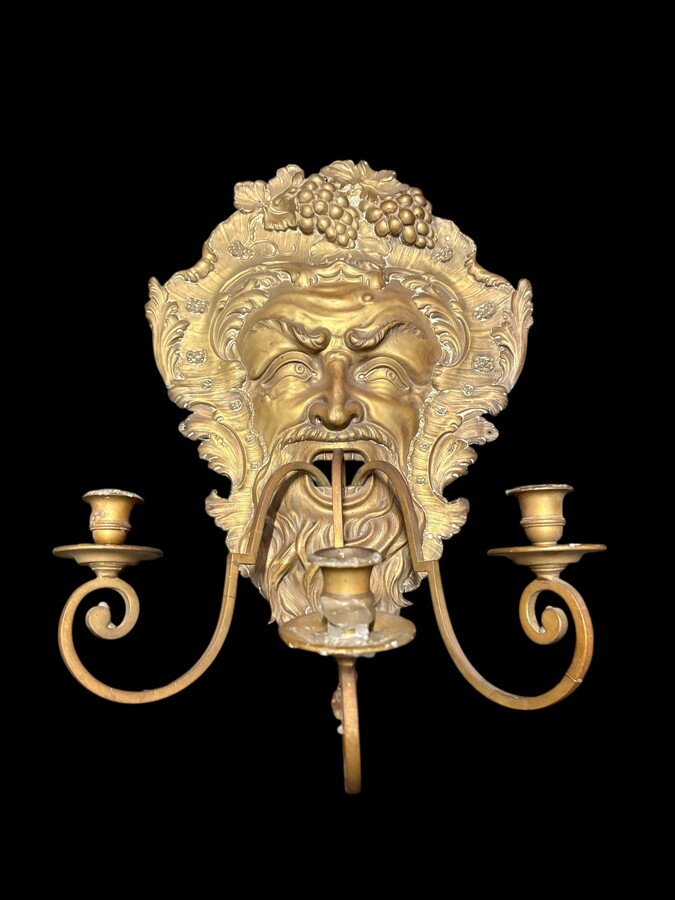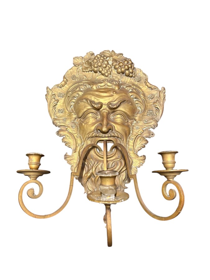 Large 18th-century copper and brass wall sconce, ‘Bacchus’. Decorative wall sconce depicting the head of Bacchus and equipped with three candle holders. Dimensions: Height: 58 cm Width: 38 cm Depth: 27 cm