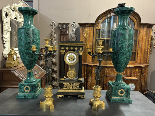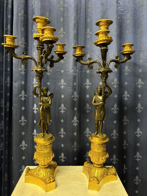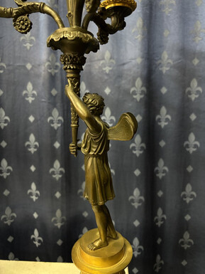 Pair of elegant bronze candelabra in the Empire style 19th century Pair of Empire period candelabra decorated with a winged man and a flame carrying a torch and four candles. They are both in very good condition