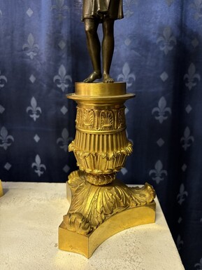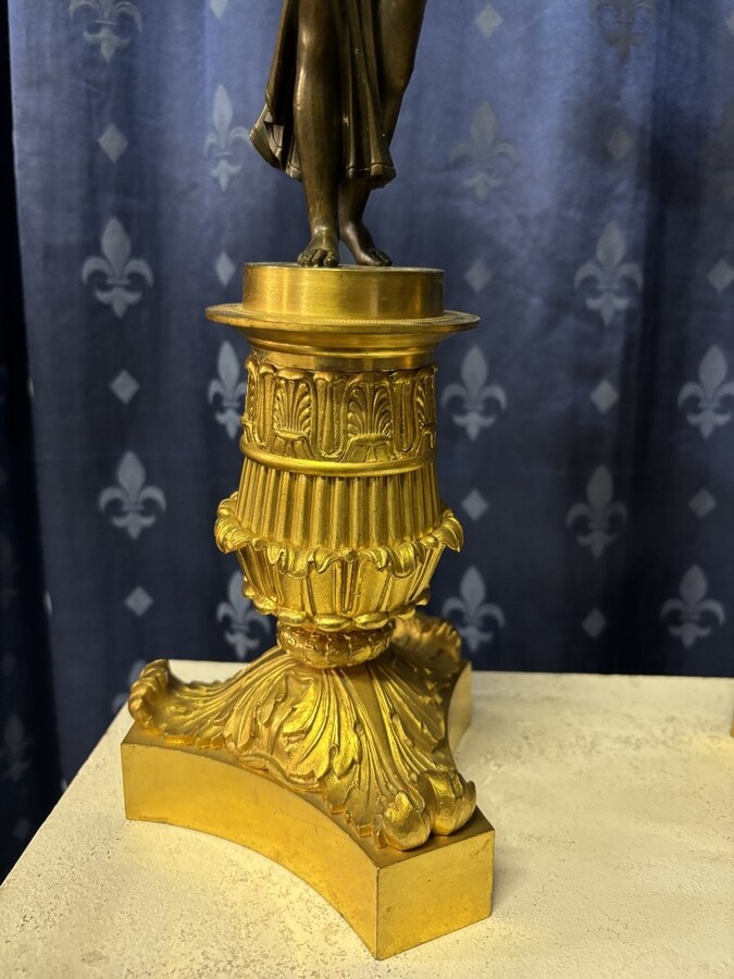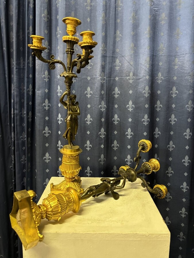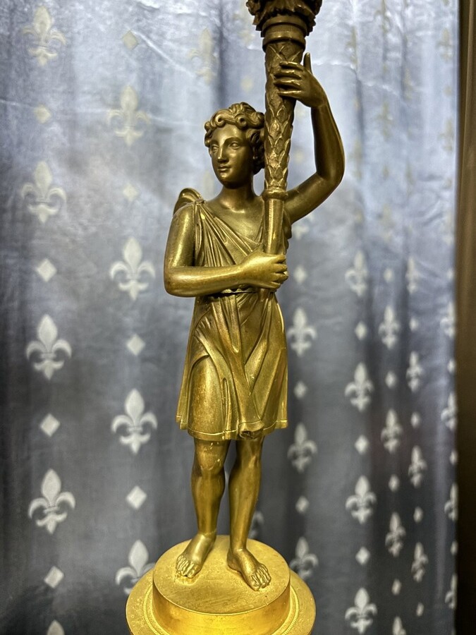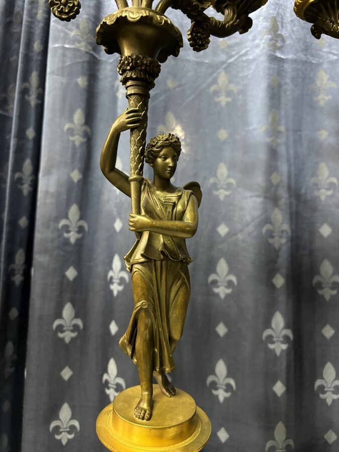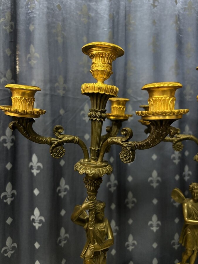 Pair of elegant bronze candelabra in the Empire style 19th century Pair of Empire period candelabra decorated with a winged man and a flame carrying a torch and four candles. They are both in very good condition