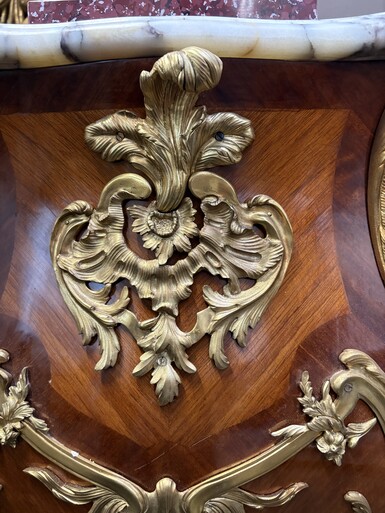 Pair of large Louis XV style marquetry/bronze columns, 20th century. High-quality columns adorned with fine marquetry and decorated with angels, ornaments and bronze feet, topped with magnificent marble. The columns are decorated all around.