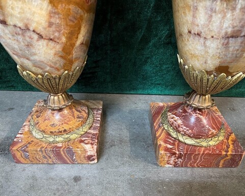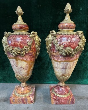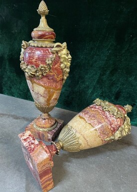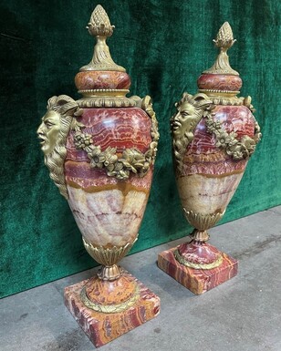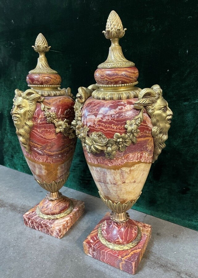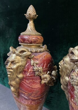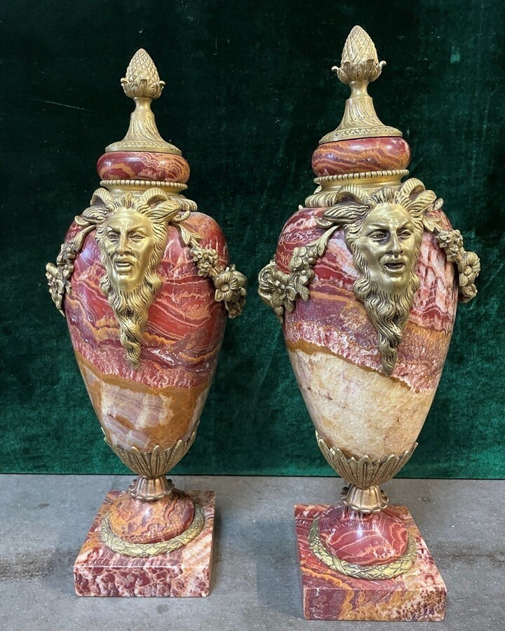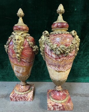 Pair of large marble cassolettes, beautifully coloured 19th century. Very decorative marble cassolettes, decorated with mythological faces and floral gyrations, resting on a marble base with bronze ornaments. Both in very good condition.