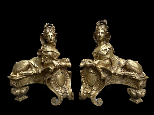 Pair of large Regency bronze ‘Sphinx’ andirons. Beautiful pair of gilt bronze andirons representing sphinxes supported by a coat of arms.Beautiful bronzes, high-quality workmanship, French, c