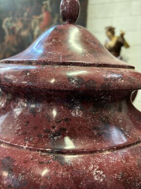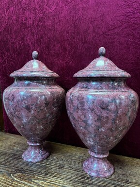 Pair of wooden lidded vases painted in imitation porphyry 20th century. Very decorative vases , the lids are fixed. Dimensions : Height : 62 cm Width : 36 cm Both in very good condition
