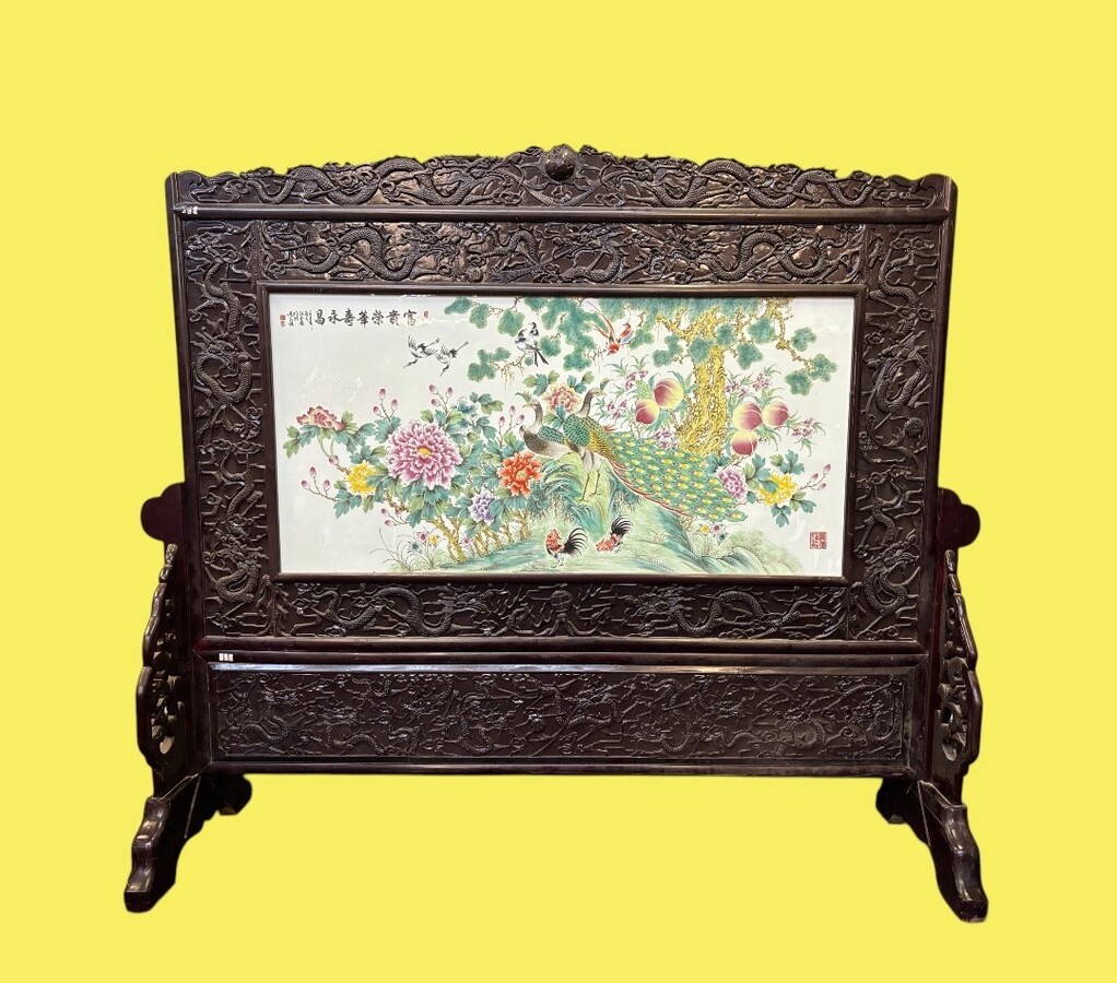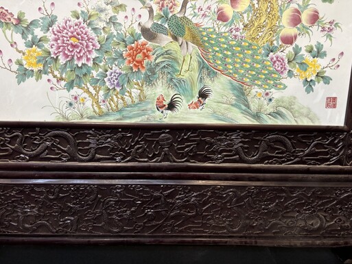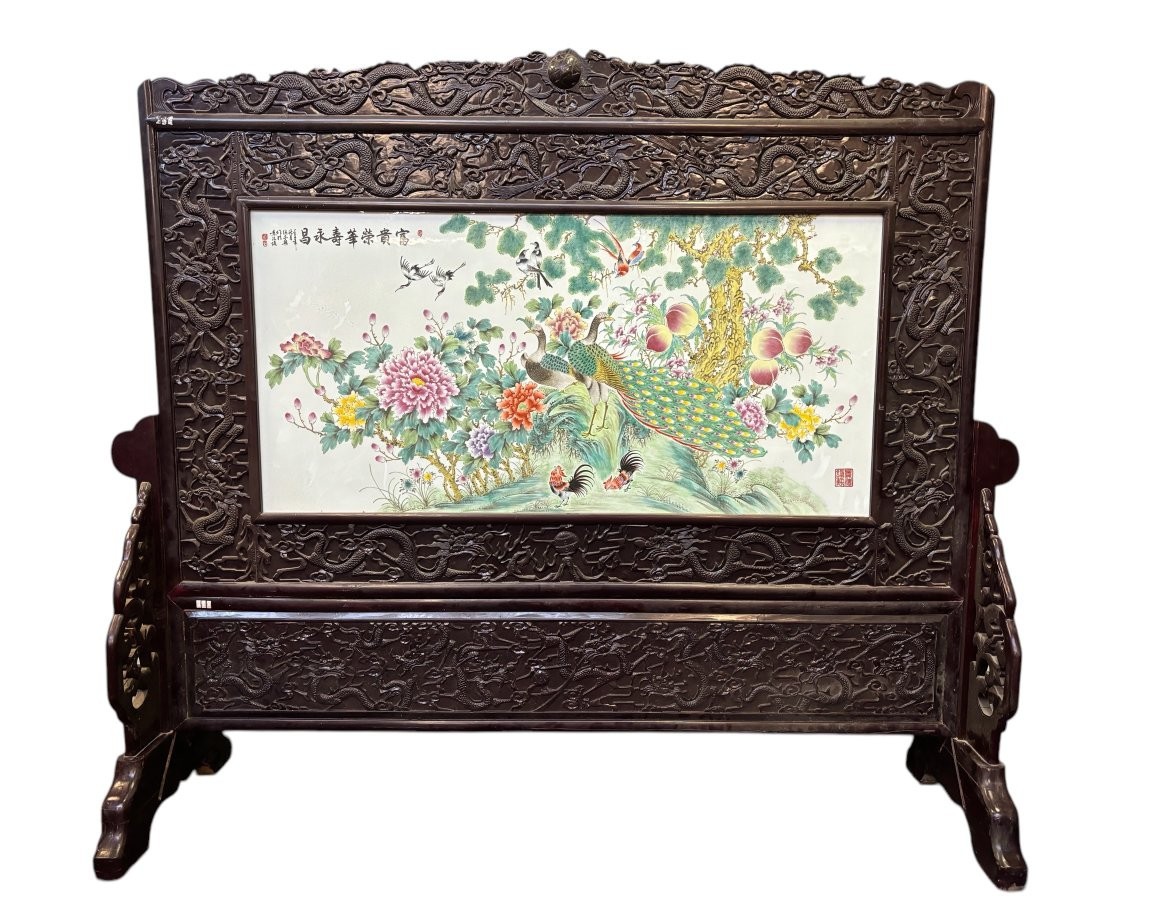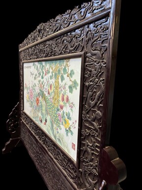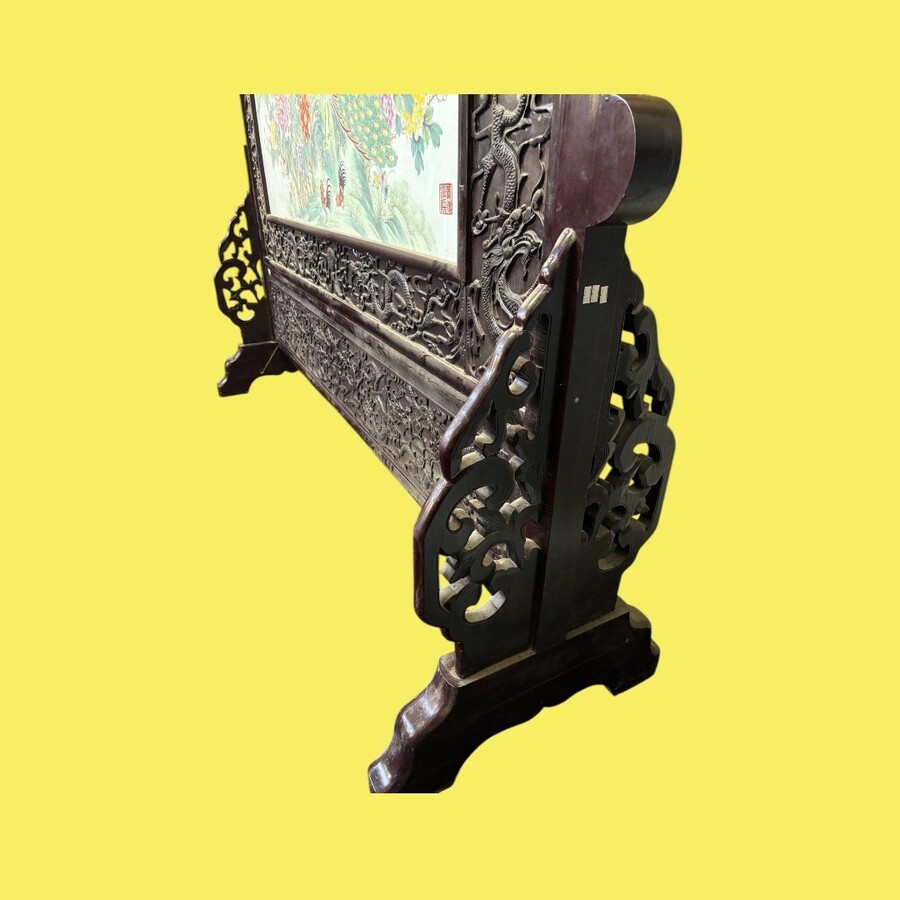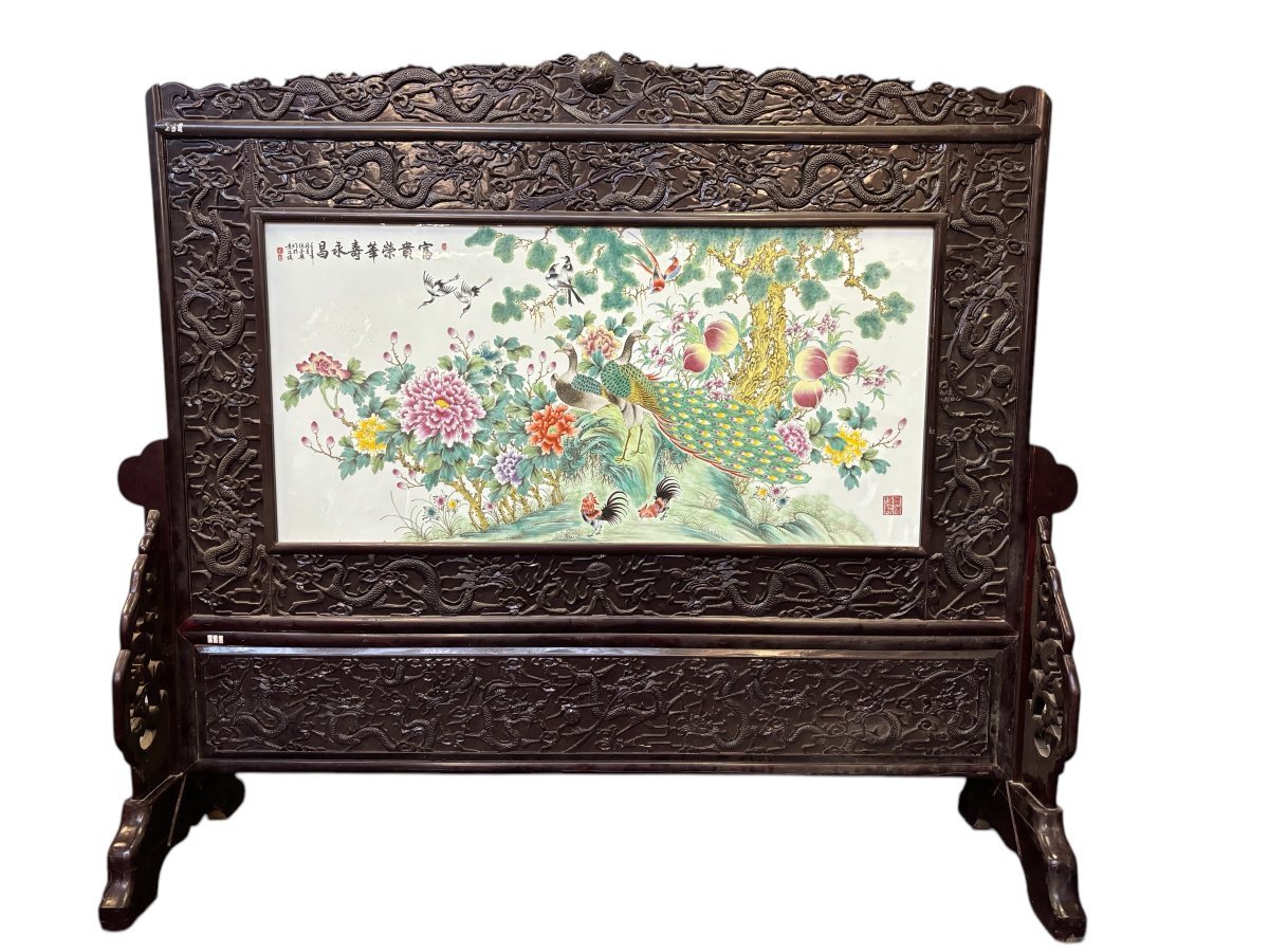 Very large late 19th century Chinese wood and porcelain folding screen/wall ( 247 cm ) Exceptional large folding screen with black lacquered carved wood frame and legs and a very large porcelain plaque signed and stamped in the centre