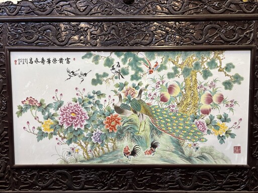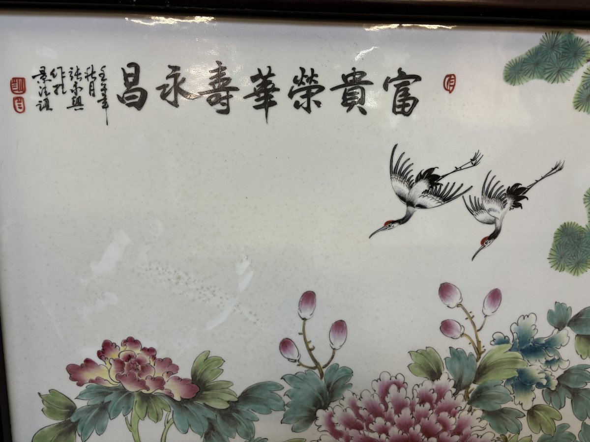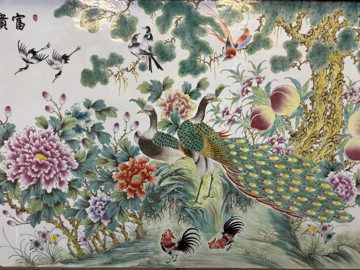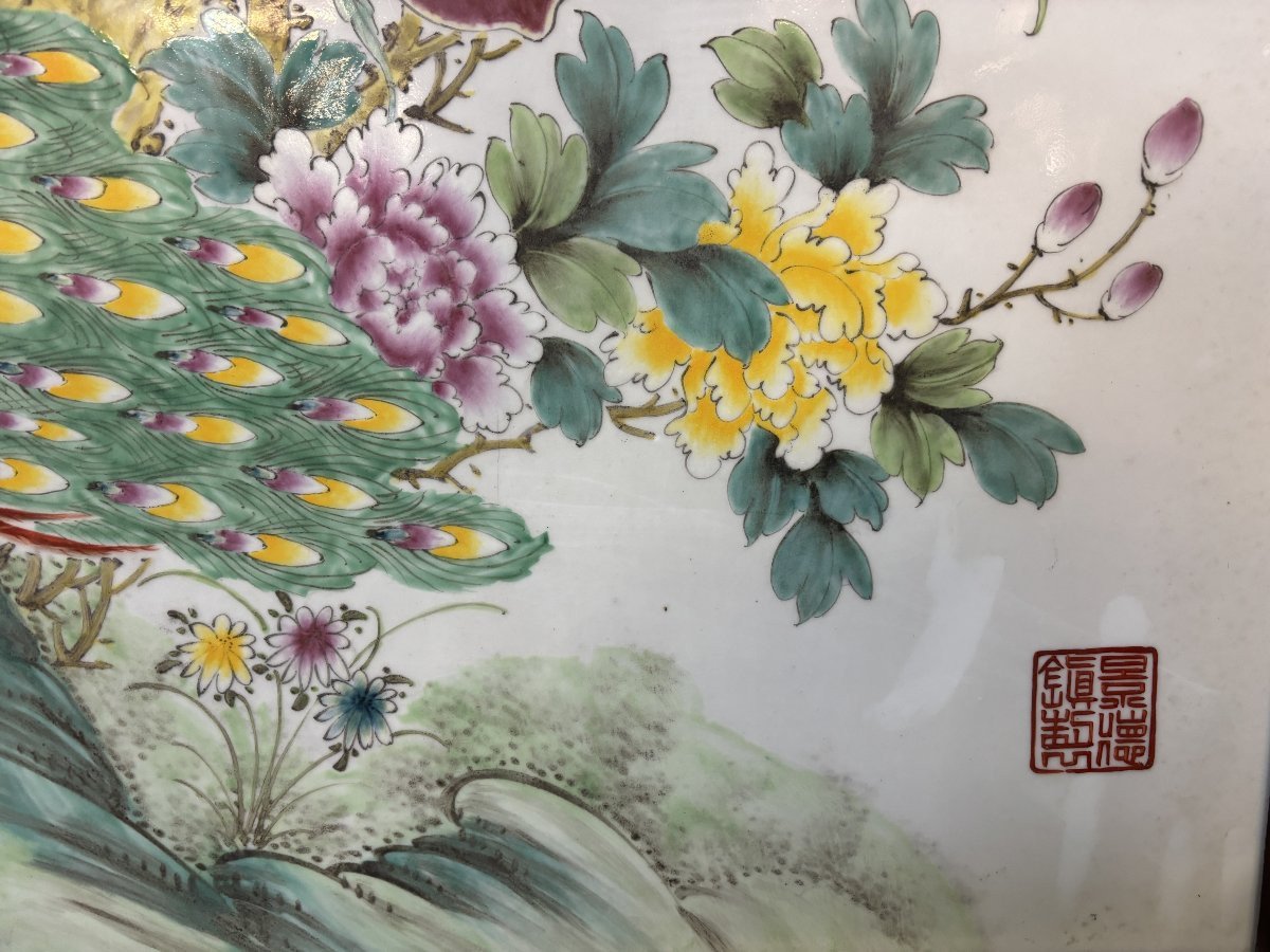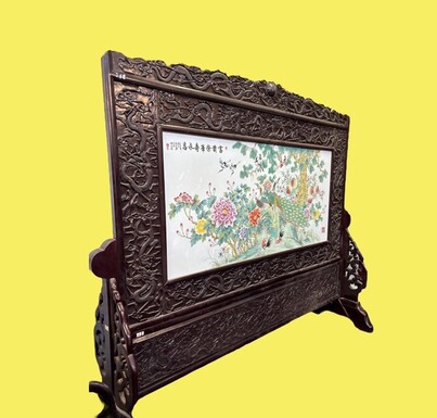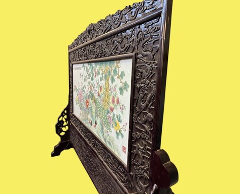Very large late 19th century Chinese wood and porcelain folding screen/wall ( 247 cm ) Exceptional large folding screen with black lacquered carved wood frame and legs and a very large porcelain plaque signed and stamped in the centre