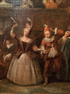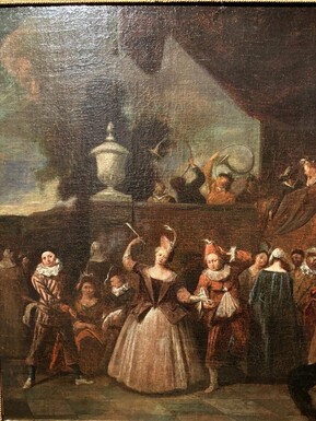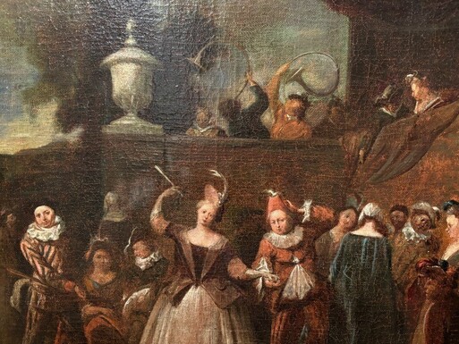 18th century painting ‘Dance scene with Harlequin’ oil on canvas. Decorative painting depicting a dance scene of nobles with a harlequin in a city garden in a beautiful gilt Empire frame.