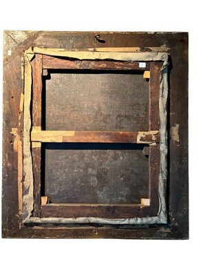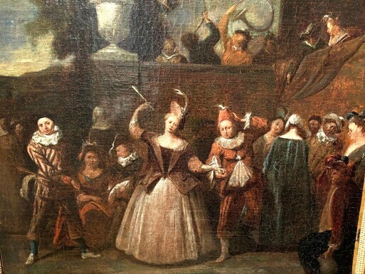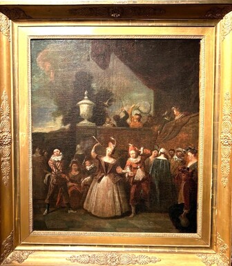 18th century painting ‘Dance scene with Harlequin’ oil on canvas. Decorative painting depicting a dance scene of nobles with a harlequin in a city garden in a beautiful gilt Empire frame.