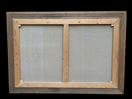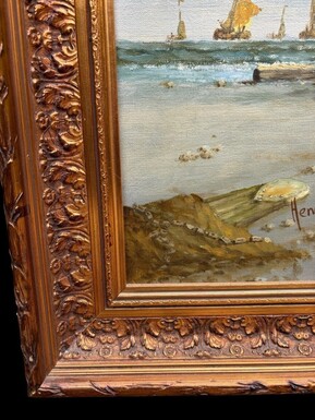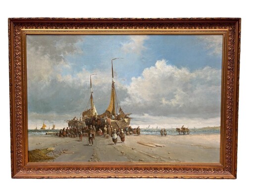 Large decorative painting ‘view of the beach’ oil on canvas 20th century. Beautiful painting depicting a beach scene with people, a horse with a cart and boats after fishing. Oil on canvas