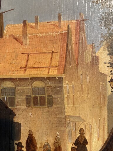 Painting ‘View of an Old Dutch Town’ oil on panel, 19th century Decorative painting in a large gilded frame depicting an old town, a street with old houses, a church, a gate with a municipal garden and various figures.