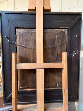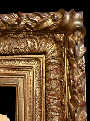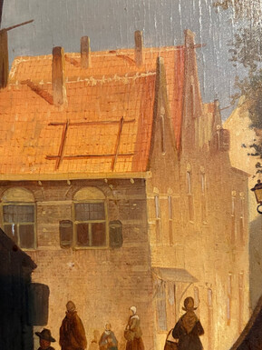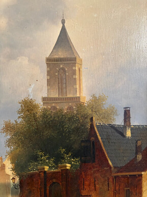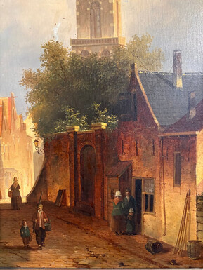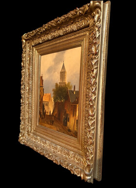 Painting ‘View of an Old Dutch Town’ oil on panel, 19th century Decorative painting in a large gilded frame depicting an old town, a street with old houses, a church, a gate with a municipal garden and various figures.