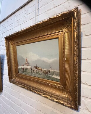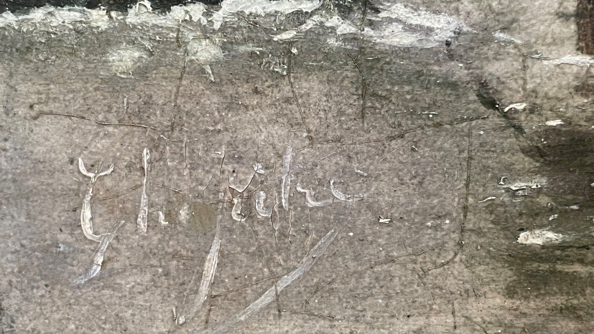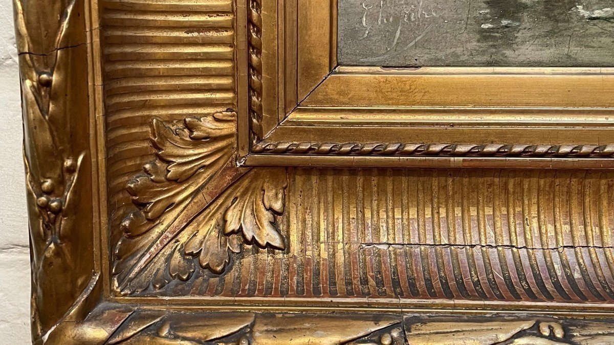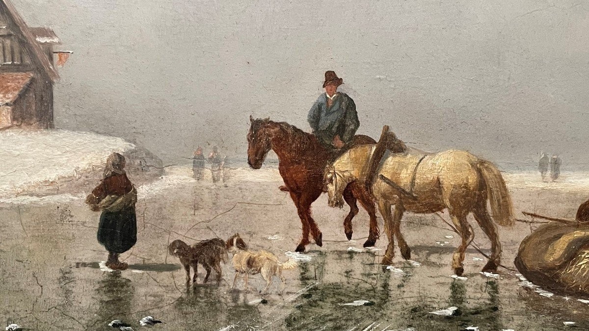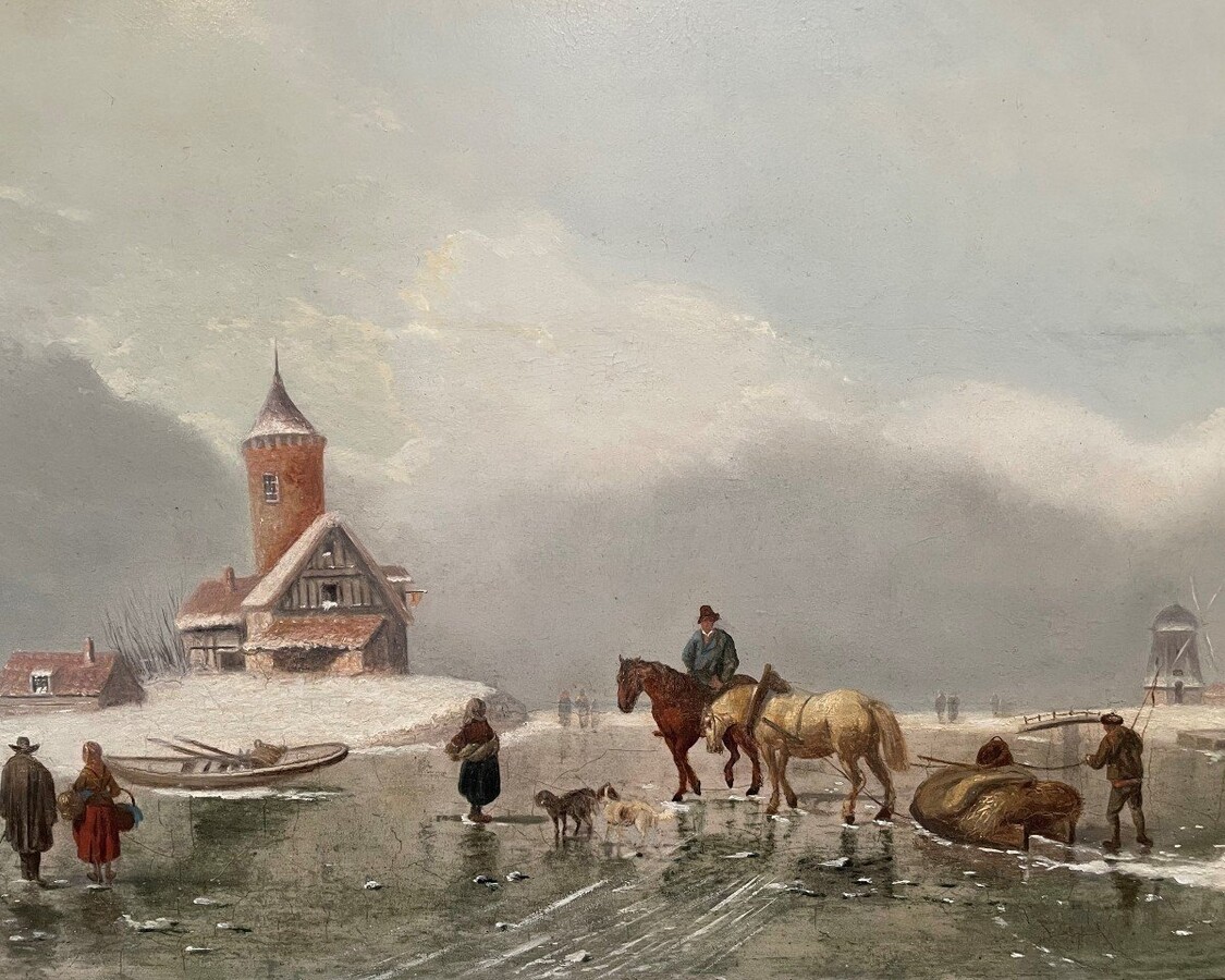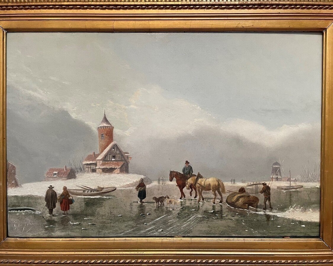 Painting Winter Landscape " On The Ice " Oil On Panel 19th Century. Decorative Painting , Signed But Illegible , In Its Original Gilt Frame. Panel In Good Condition , Frame Has Some Flaws. Dimensions : Height : 30,5 / 55 Cm Width : 47 / 71 Cm