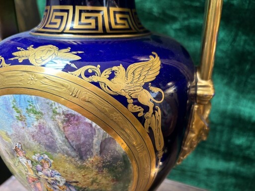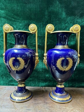 Pair of Empire style porcelain vases Sèvres , 20th Century Pair of vases with romantic paintings in blue and gilt tones. Signed by G.Etemod and underneath marked with Sèvres sign Dimensions : Height : 55 cm Width : 28 cm Diameter foot : 18 cm In