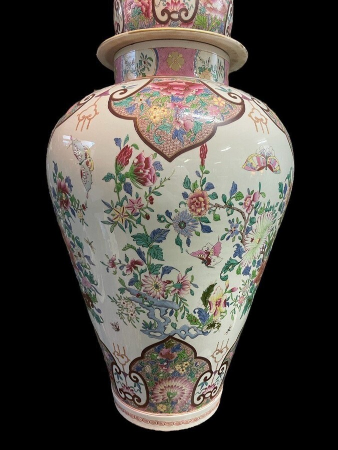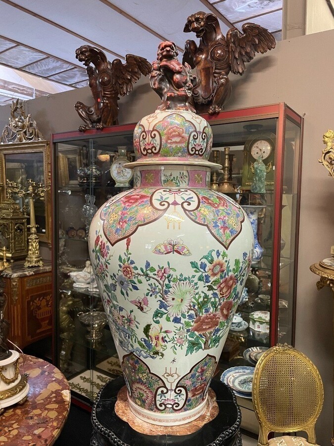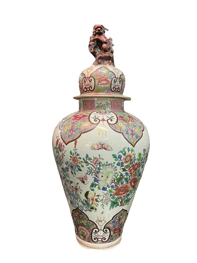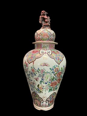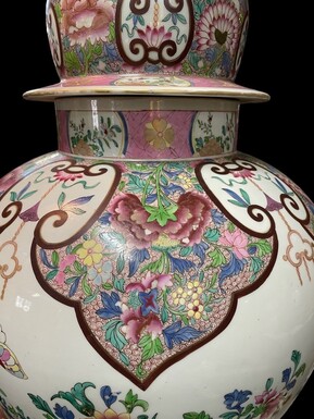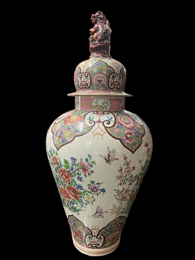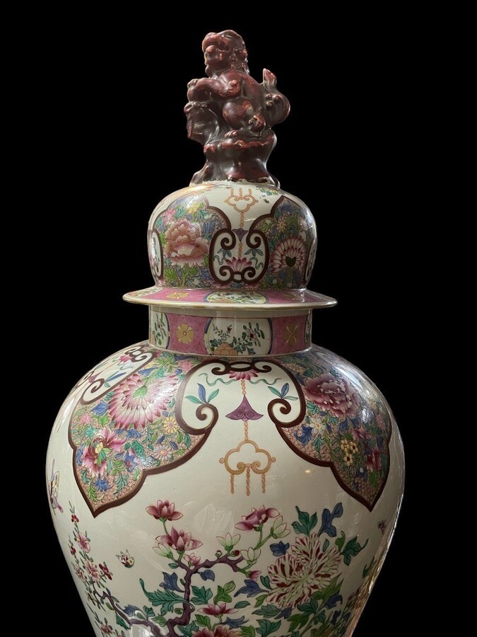 Very large famille rose style lidded vase, Samson, France, 19th century Decorative porcelain lidded vase with beautiful painting and foodog on the lid. The vase is slightly damaged at the top of the neck (inside) and the lid is chipped (inside).
