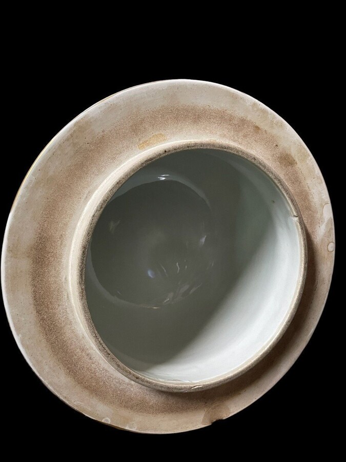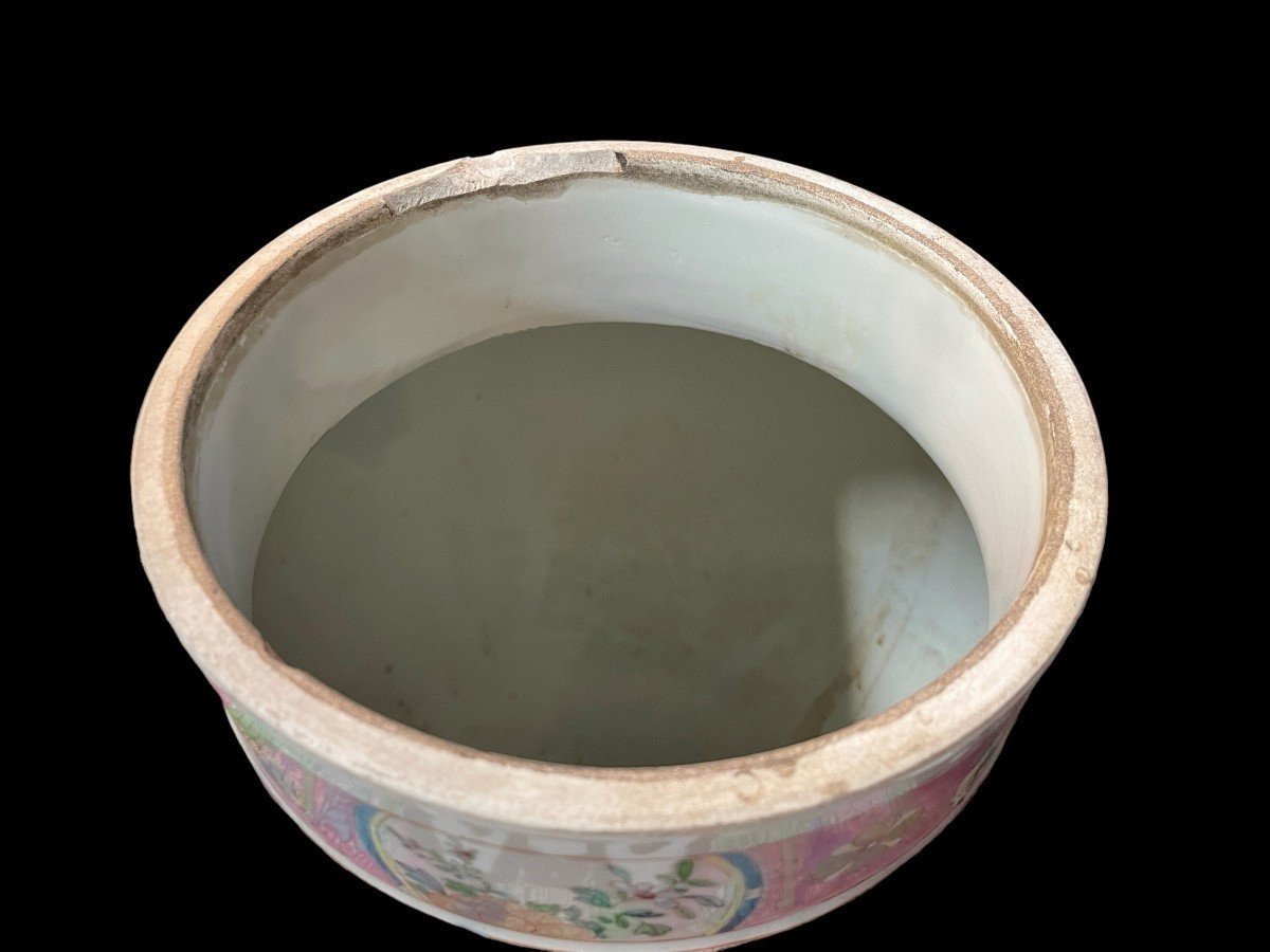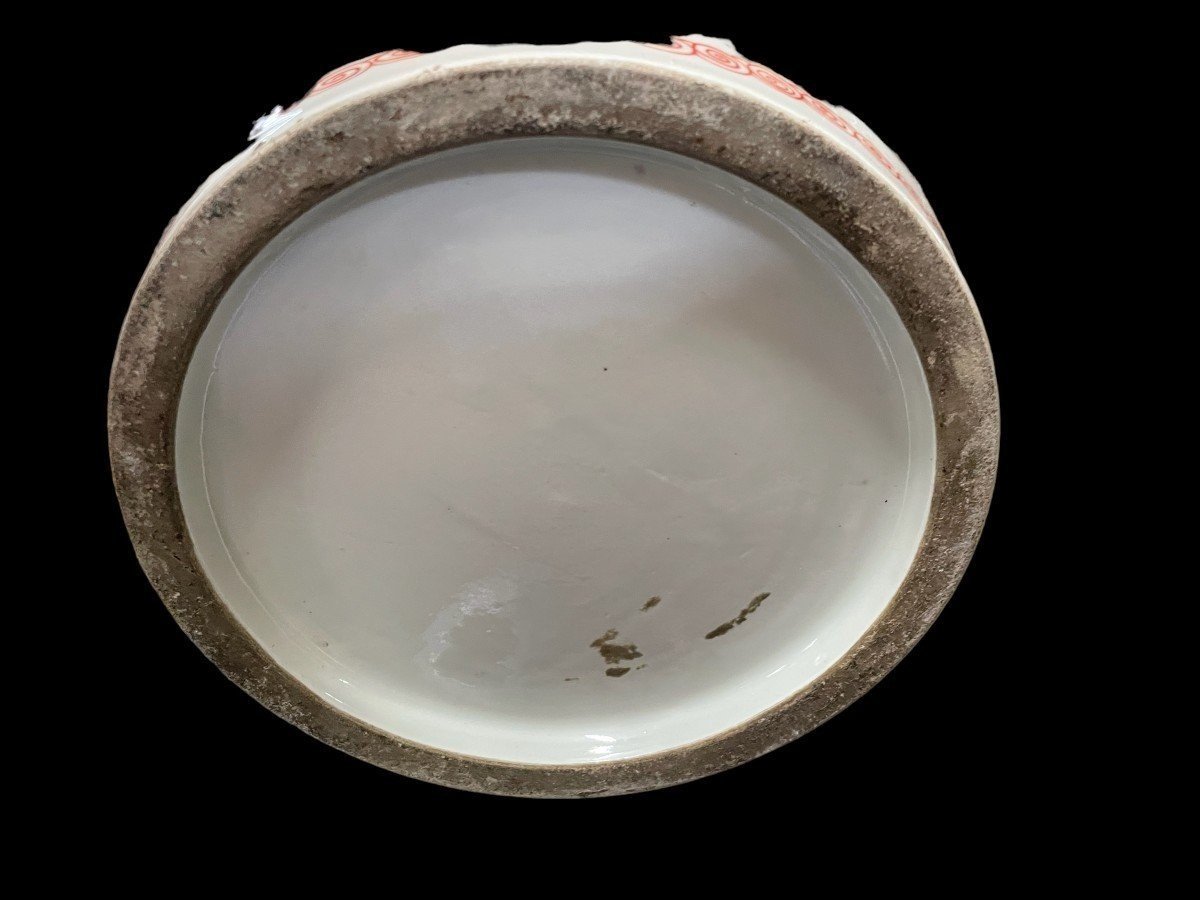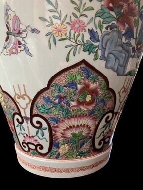 Very large famille rose style lidded vase, Samson, France, 19th century Decorative porcelain lidded vase with beautiful painting and foodog on the lid. The vase is slightly damaged at the top of the neck (inside) and the lid is chipped (inside).