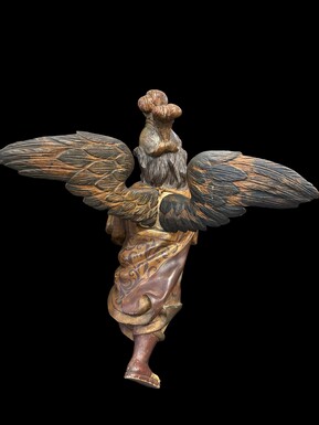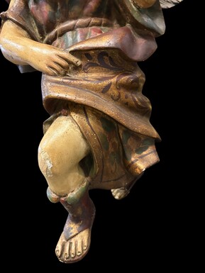 A lovely 18th-century polychrome wooden angel A decorative angel carved from wood and beautifully painted The angel is in good condition, with minor damage to the lower part of one wing. Dimensions: Height: 68 cm Width: 54 cm