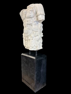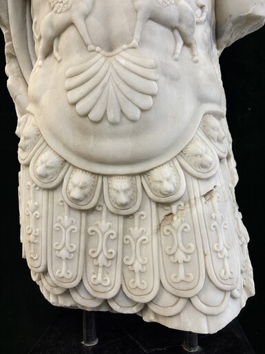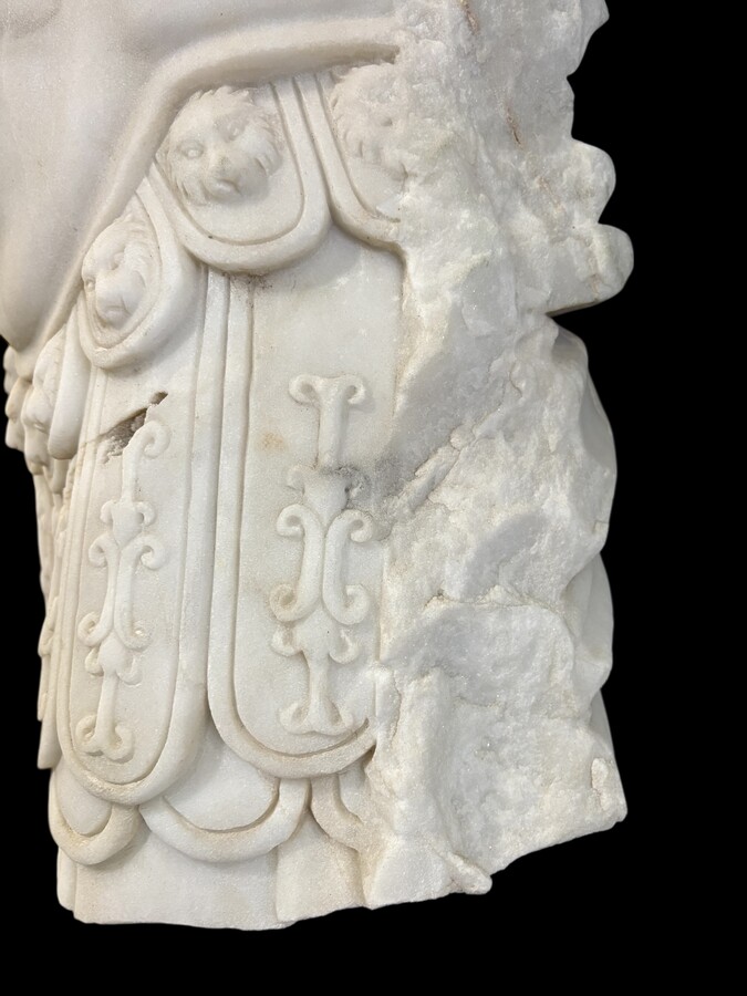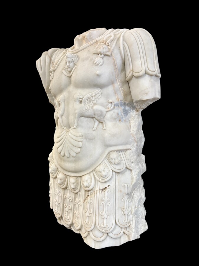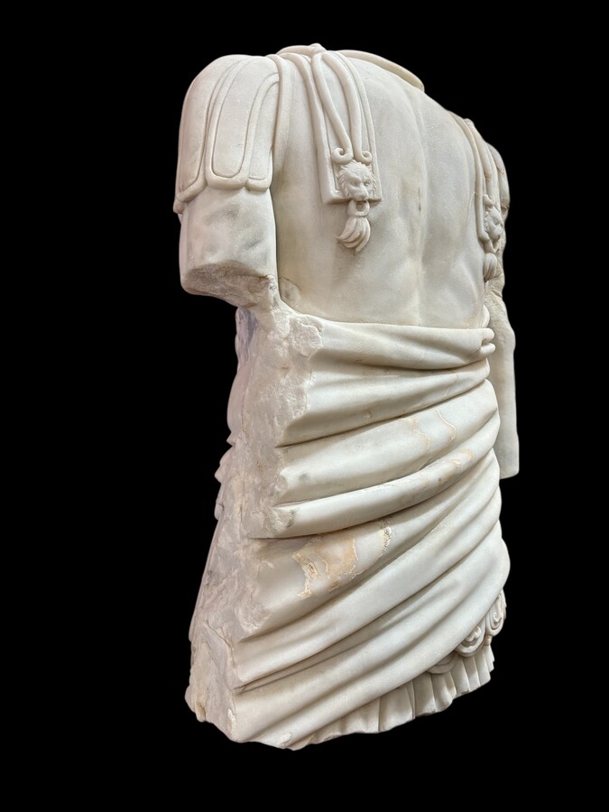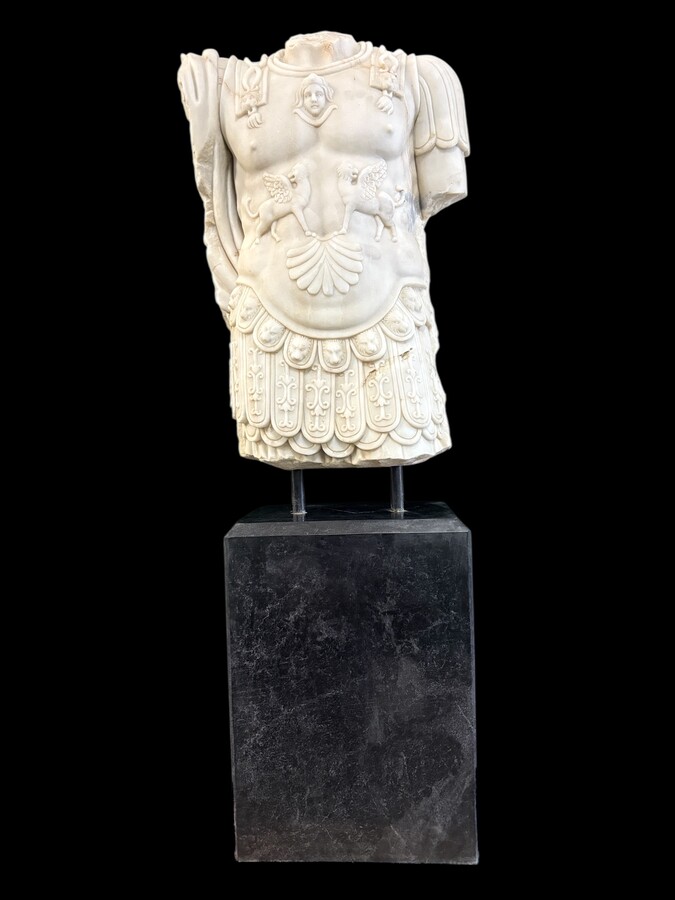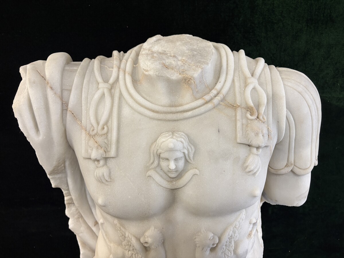 An impressive sculpture of a Roman torso in white marble, exuding the power and beauty of classical antiquity. The detailed breastplate is richly decorated with hand-carved mythological motifs.